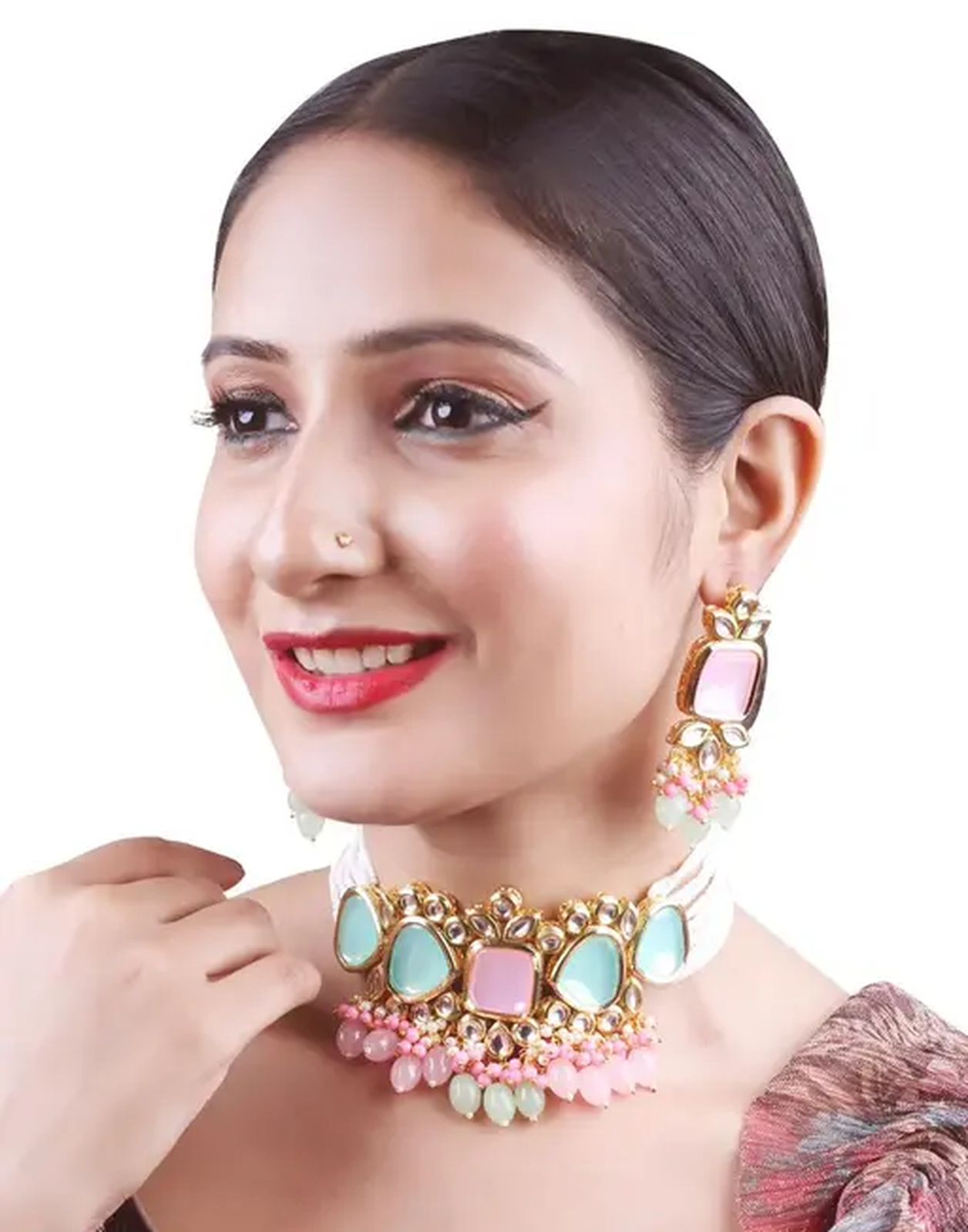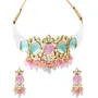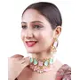 Elevate your ethnic look with this stunning Indian jewelry set featuring a luxurious Kundan choker necklace and matching statement earrings. The necklace showcases exquisite craftsmanship with intricate gold-toned metalwork adorned with vibrant multi gemstones and delicate pearl accents. The choker design is beautifully complemented by dangling multi beads that add movement and grace.The coordinating earrings feature a similar motif with a large pink gemstone surrounded by gold detailing and finished with cascading red beads. This set perfectly balances traditional Indian design with contemporary elegance, making it ideal for weddings, festivals, or any special occasion where you want to make a lasting impression.Key features: Kundan-style choker necklace with matching earrings Gold-toned metalwork with red gemstones Pearl and multi bead embellishments Perfect for Indian weddings and traditional events Versatile design to complement various ethnic outfits