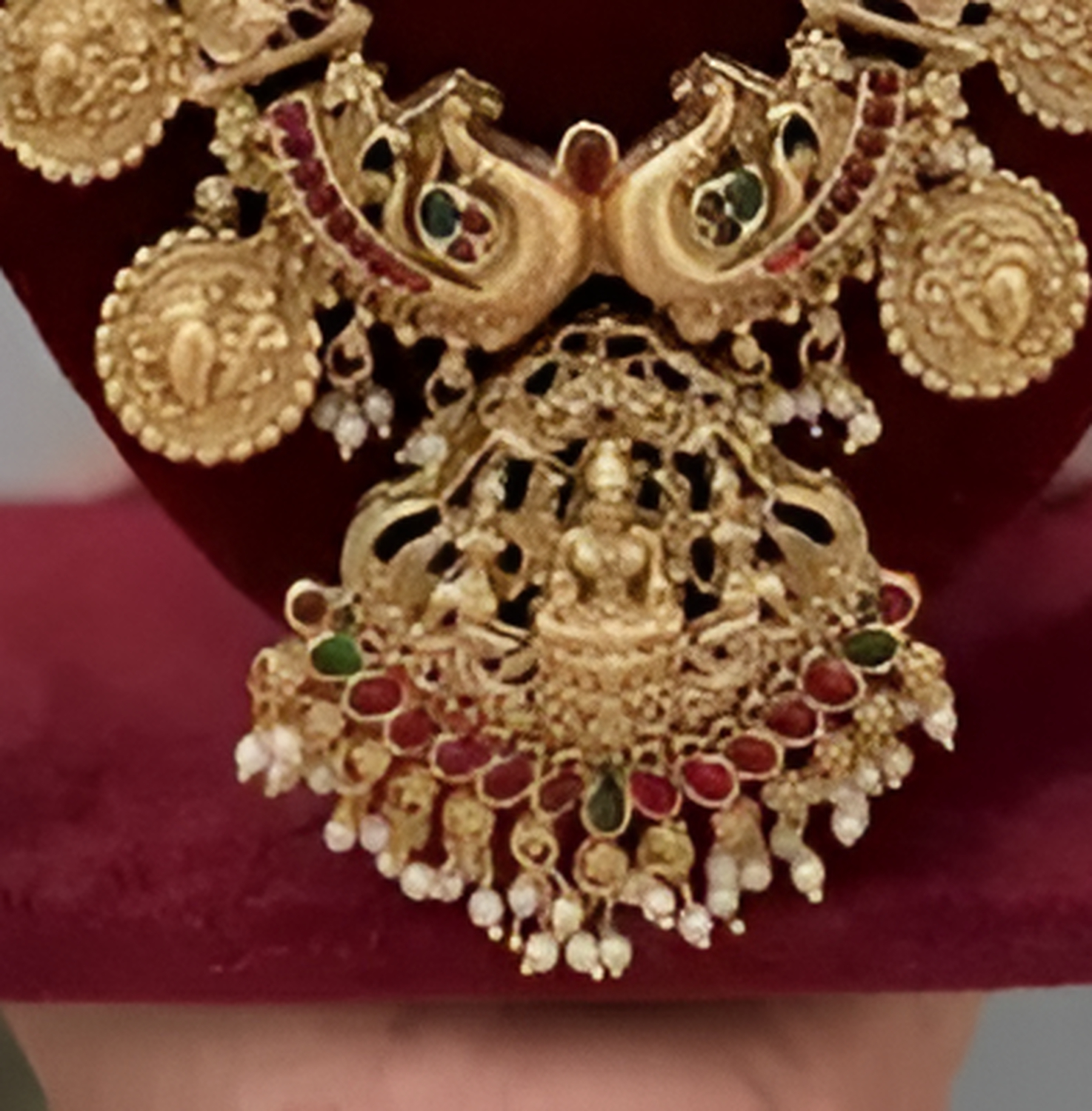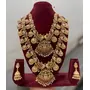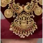 Elevate your bridal ensemble with this exquisite temple-inspired jewelry set featuring intricate Lakshmi motifs and traditional craftsmanship. This stunning multi-layered necklace showcases beautifully detailed antique gold-plated coin pendants arranged in cascading rows, culminating in two ornate goddess pendants adorned with colorful kundan stones and delicate pearl droplets.The matching jhumka earrings perfectly complement the necklace with their bell-shaped design and meticulous detailing. Each piece in this set reflects centuries-old artisanal techniques, making it a treasured addition to your ethnic jewelry collection.Key Features: Handcrafted multi-strand design with coin motifs and temple-inspired goddess pendants Premium gold-plated finish with antique styling for timeless appeal Adorned with kundan work, enamel detailing, and pearl accents Perfect statement piece for South Indian weddings, Diwali celebrations, and festive occasions Pairs beautifully with traditional silk sarees, lehengas, and ethnic formal wearMake a grand entrance at your next celebration with this heritage-inspired jewelry set that combines cultural symbolism with exquisite craftsmanship. Order now to add this heirloom-quality piece to your collection!