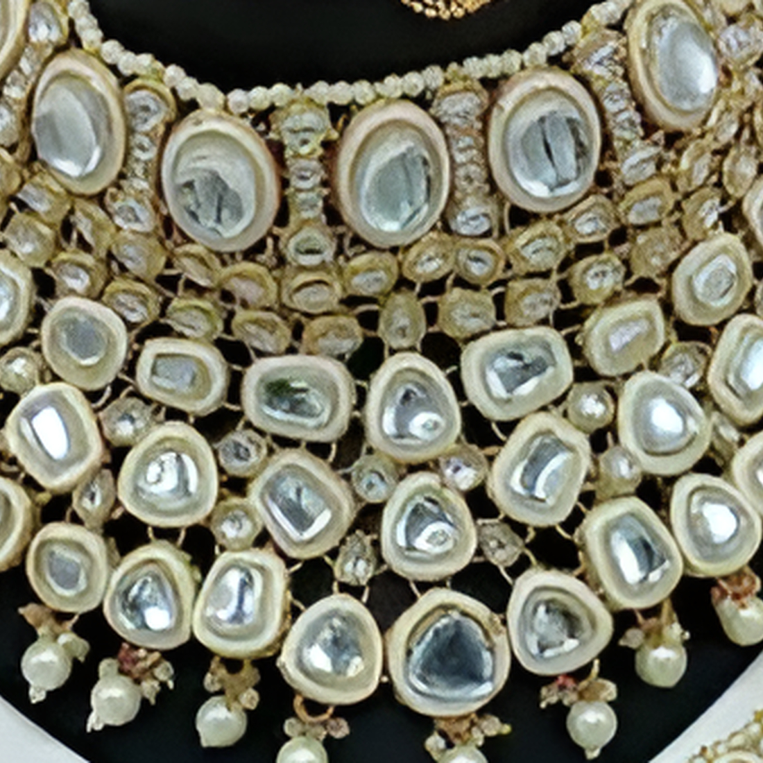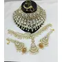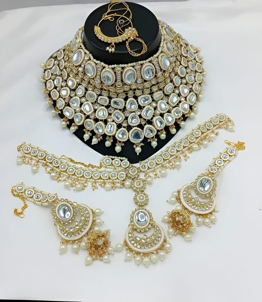 Elevate your bridal ensemble with this exquisite handcrafted Kundan Polki jewelry set, meticulously designed for the modern bride seeking traditional elegance. This complete bridal collection features a spectacular statement choker necklace adorned with intricate Kundan stones set in gold-plated frames, complemented by matching earrings, maang tikka, and nosering.The stunning choker showcases multiple rows of premium glass Kundan stones in varying shapes, creating a dazzling effect that catches light from every angle. Delicate pearl drops add movement and grace to this regal piece. The matching earrings feature a beautiful layered design with statement Kundan centerpieces and pearl clusters that frame the face beautifully.Perfect for weddings, engagement ceremonies, and festive occasions, this jewelry set pairs wonderfully with lehengas, sarees, and anarkalis in any color palette. The versatile gold-tone finish complements both traditional and contemporary outfits, making it a must-have addition to your ethnic jewelry collection.Lightweight despite its grand appearance, this set ensures comfort throughout long celebrations. The adjustable clasps provide a secure and comfortable fit for all-day wear.Transform into royalty on your special day with this timeless heirloom-quality jewelry set that combines centuries-old craftsmanship with contemporary design sensibilities.Order now to add this breathtaking Kundan Polki set to your jewelry collection and make a statement at your next celebration!