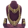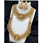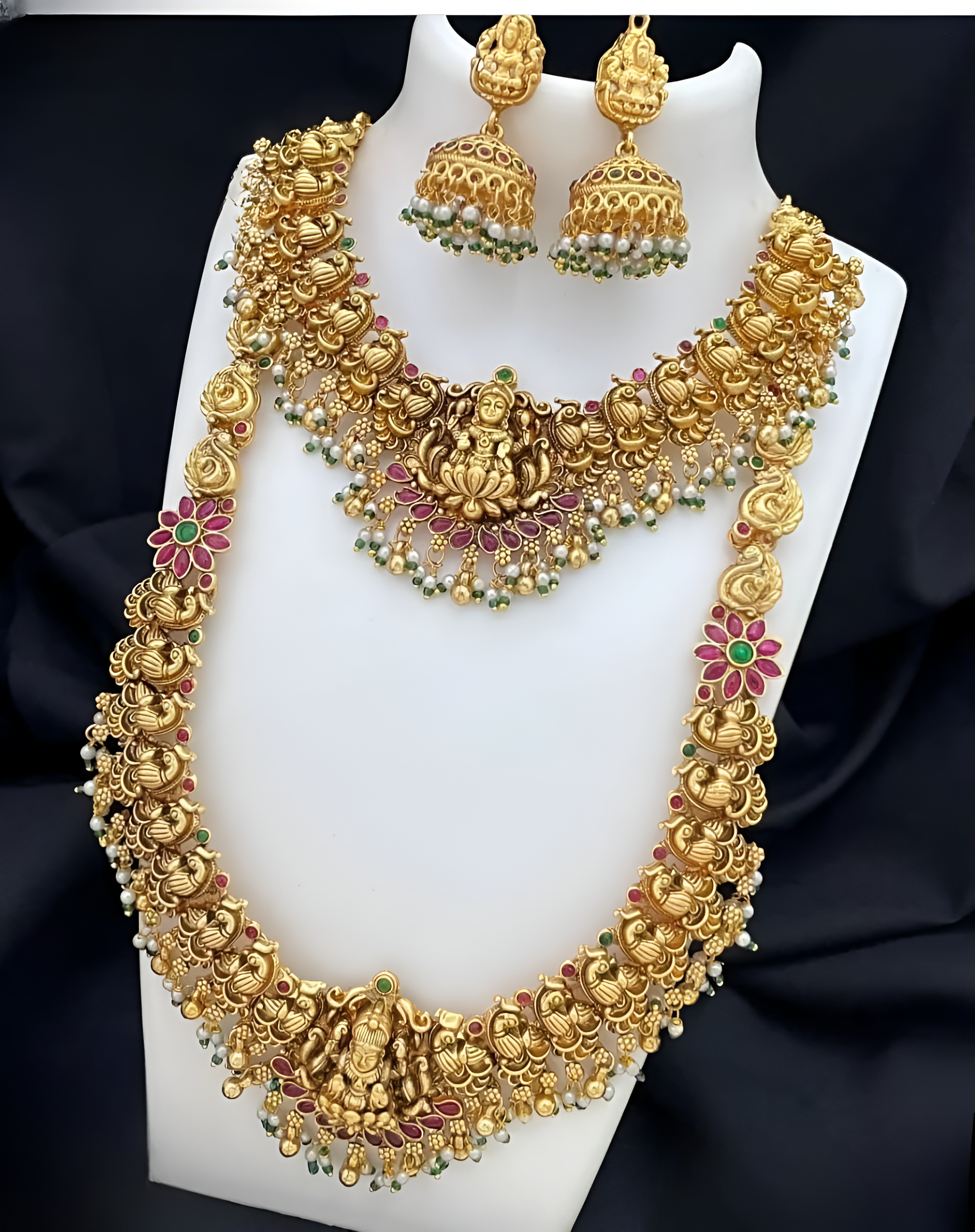Adorn yourself with divine elegance through this magnificent temple jewelry set featuring intricate Goddess Lakshmi motifs that embody prosperity and auspiciousness. This exquisite handcrafted collection showcases traditional South Indian temple artistry with contemporary appeal for the modern bride.The elaborate set includes a stunning choker necklace with cascading pearl droplets, a matching long haram (necklace) with floral accents, and beautifully designed jhumka earrings that create a harmonious ensemble. Each piece is meticulously crafted with gold-plated metal and adorned with vibrant pink kemp stones, emerald green accents, and delicate pearl clusters for a royal appearance.Key Features: Divine Craftsmanship: Features detailed Goddess Lakshmi motifs on both necklaces, symbolizing prosperity and abundance Premium Materials: Gold-plated metal with premium pink kemp stones, green stone accents, and pearl embellishments Complete Set: Includes choker necklace, long haram, and matching jhumka earrings Versatile Design: Perfect for South Indian weddings, traditional ceremonies, temple visits, and cultural festivals Artisanal Quality: Each piece handcrafted by skilled artisans preserving centuries-old jewelry-making traditionsThis regal jewelry set pairs exquisitely with kanjeevaram silk sarees, wedding lehengas, and traditional half-sarees. The intricate temple design elements make it a treasured heirloom piece that can be passed down through generations.Transform your bridal look with this statement temple jewelry set that combines cultural significance with breathtaking beauty. The adjustable design ensures a comfortable fit, while the lightweight construction allows for extended wear during lengthy ceremonies and celebrations.Order today to add this temple-inspired masterpiece to your collection and experience the perfect blend of tradition and elegance on your special occasions!