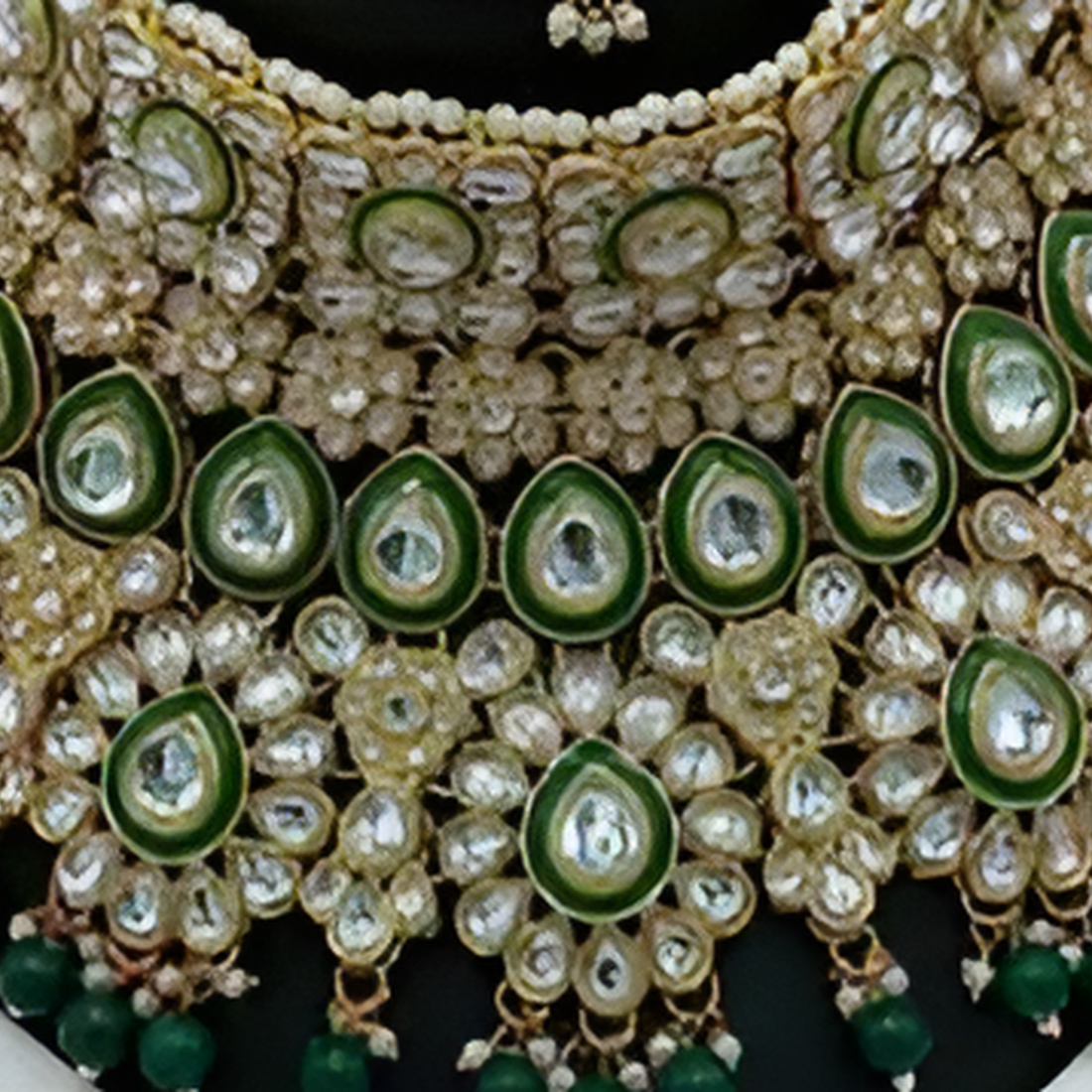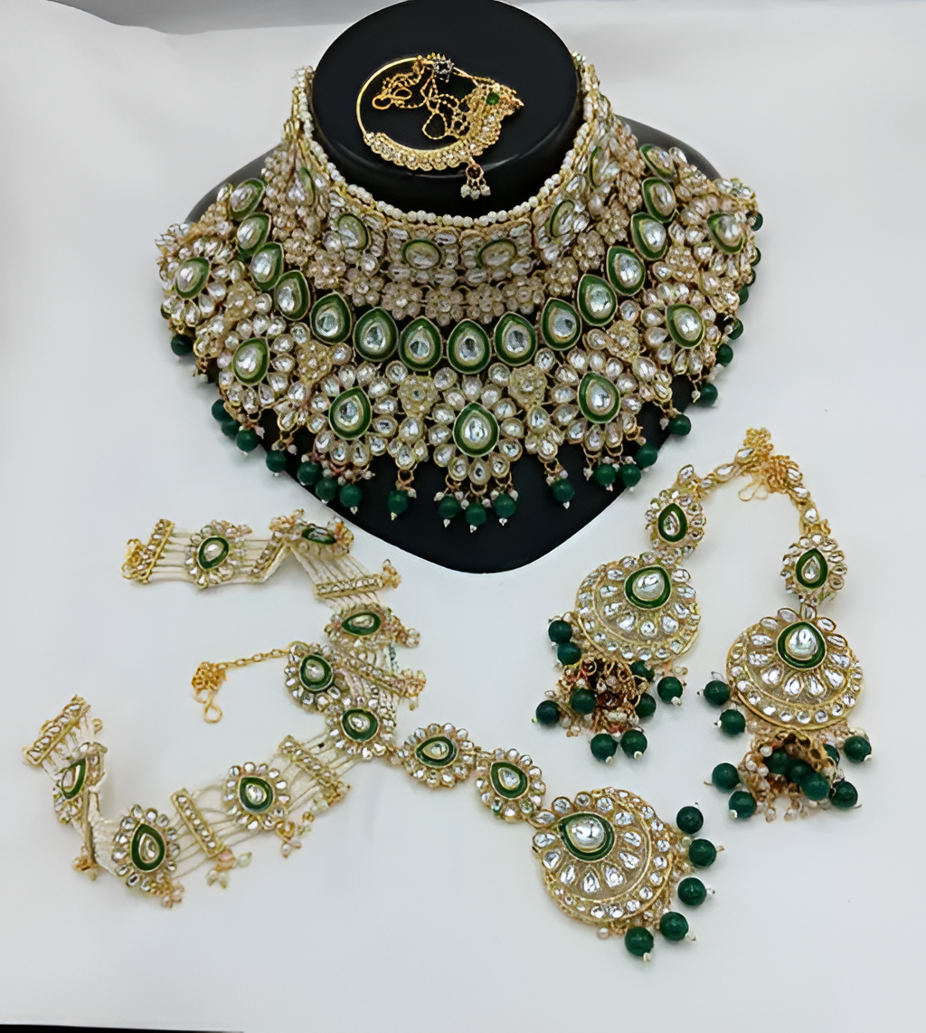 Elevate your bridal ensemble with this magnificent handcrafted Kundan jewelry set featuring an elaborate emerald green meenakari design. This traditional Indian bridal collection combines the timeless elegance of Kundan craftsmanship with the opulent allure of emerald-hued stones, creating a showstopping statement piece that radiates royal sophistication.Exquisite Features: Complete Luxury Set: Includes choker necklace, statement earrings, matching mangtika, and ornate nose ring Premium Artisanal Craftsmanship: Each piece meticulously handcrafted by skilled artisans using traditional techniques Stunning Materials: Features gold-plated settings with intricate Kundan stonework, lustrous pearls, and vibrant emerald green accents Ornate Design Elements: Showcases multiple rows of pearls, clear polki stones, and detailed meenakari work in rich emerald green Versatile Glamour: Perfect for bridal wear, festive celebrations, cultural ceremonies, and special occasions worldwide Heritage-Inspired: Embodies the elegance of traditional South Asian jewelry design with contemporary appealPerfect For: Brides seeking a statement bridal set for wedding ceremonies Festival celebrations including Diwali, Eid, and Karwa Chauth Formal cultural events and traditional ceremonies Pairing with sarees, lehengas, anarkalis, or fusion Indo-western outfits Collectors of distinctive ethnic jewelry pieces Gifting for special occasions and milestone celebrationsTransform your look with this extraordinary jewelry collection that combines centuries of artistic tradition with breathtaking design. The rich emerald green accents beautifully complement outfits in jewel tones, pastels, or classic colors, making this versatile set a treasured addition to your jewelry collection.Order today to experience the unparalleled craftsmanship and timeless beauty of this authentic handcrafted Kundan jewelry set.