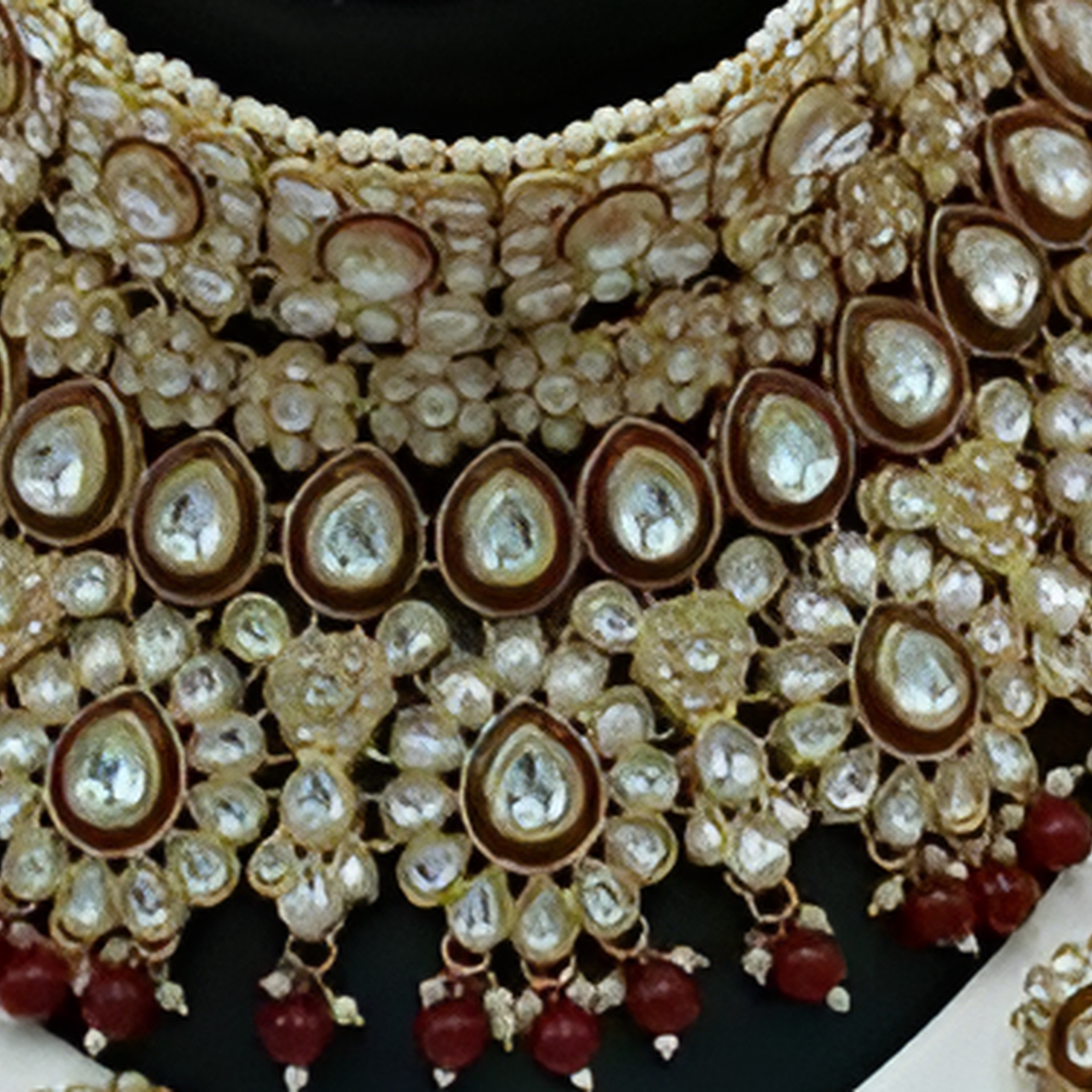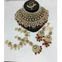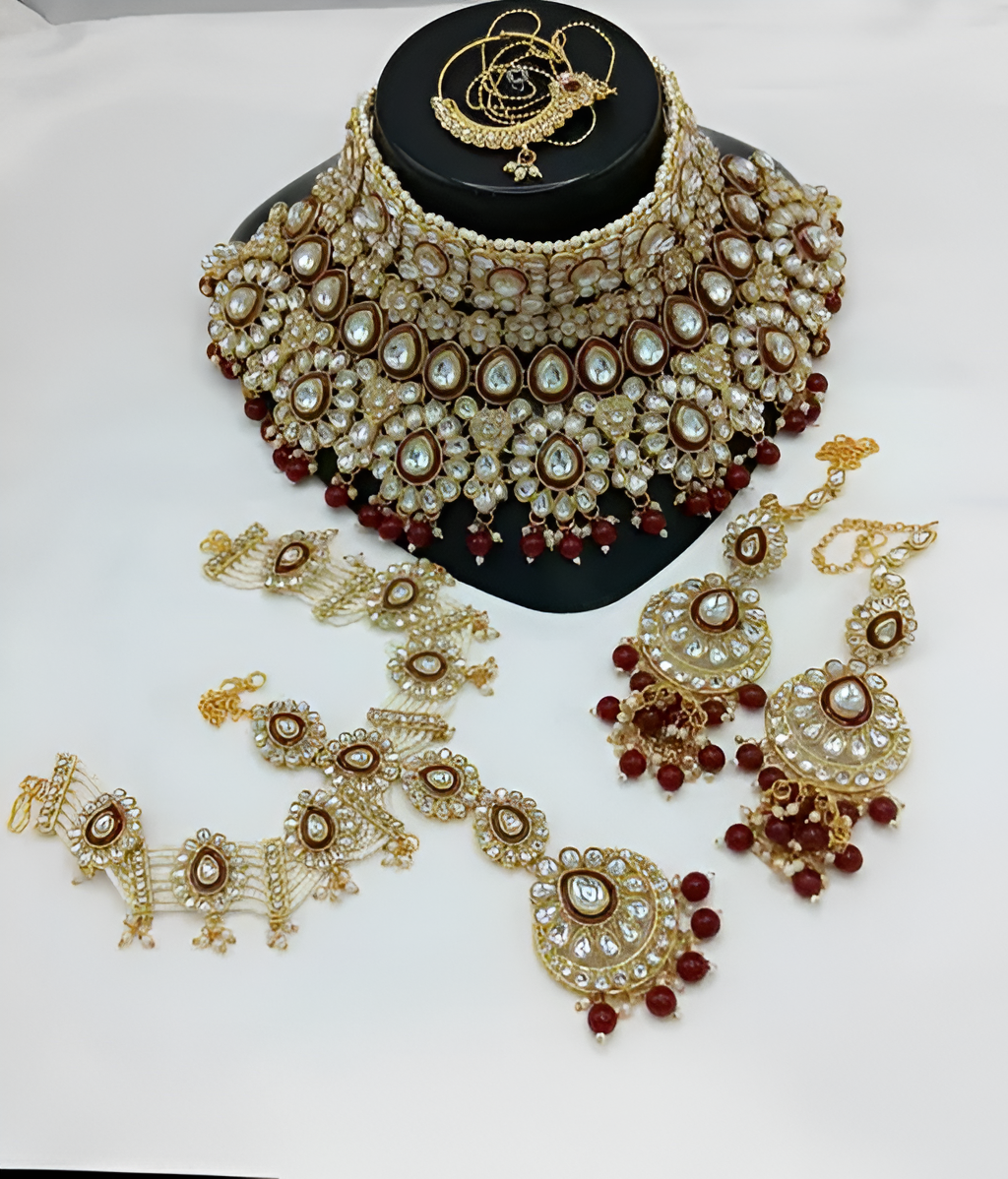 Make a regal statement with this breathtaking handcrafted Kundan jewelry set featuring exquisite ruby-colored accents and lustrous pearl embellishments. This complete bridal collection showcases the finest traditional Indian craftsmanship, combining timeless Kundan stonework with rich ruby-hued beads for a truly majestic look that commands attention.Premium Features: Complete Luxury Collection: Includes an elaborate choker necklace, statement chandelier earrings, matching mangtika, and ornate nose ring Artisanal Excellence: Meticulously handcrafted by skilled artisans using centuries-old techniques passed through generations Luxurious Materials: Features gold-plated settings with intricate Kundan stonework, abundant pearl detailing, and striking ruby-colored bead accents Opulent Design: Showcases multiple rows of pearls, clear polki stones, and detailed maroon/ruby meenakari work in a mesmerizing pattern Heritage Craftsmanship: Embodies the rich cultural tradition of South Asian jewelry with contemporary wearability Unmatched Brilliance: Each polki stone is carefully positioned to maximize light reflection for extraordinary sparklePerfect For: Bridal ceremonies and wedding celebrations Traditional cultural events including Diwali, Karwa Chauth, and Eid Black-tie galas and formal occasions requiring statement jewelry Pairing with sarees, lehengas, anarkalis, or indo-western fusion outfits Collectors of museum-quality ethnic jewelry pieces Meaningful gift for special milestone celebrationsThis extraordinary jewelry set exemplifies royal elegance with its remarkable combination of pearl clusters and ruby-colored embellishments. The rich contrast between the lustrous pearls, brilliant Kundan stones, and deep ruby accents creates a sophisticated palette that complements a wide range of traditional attire in crimson, cream, gold, royal blue, or emerald green.Elevate your bridal ensemble or make an unforgettable entrance at your next special occasion with this heirloom-quality jewelry collection that balances timeless tradition with contemporary luxury.Order today to experience the unparalleled craftsmanship and regal beauty of this authentic handcrafted Kundan jewelry set that will become a treasured keepsake for generations.