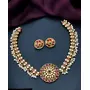 Drape yourself in elegance with this exquisite Kundan choker necklace set, featuring a floral pendant adorned with ruby, emerald, and pearl accents. The gold-plated handcrafted design is embellished with delicate pearls, making it the perfect blend of royal heritage and modern charm. Comes with matching stud earrings to complete the look.Ideal for weddings, parties, and festive occasions, this choker set enhances your traditional attire with unmatched grace.? Premium quality Kundan craftsmanship? Elegant pearl detailing for a regal touch? Lightweight & comfortable for all-day wear? Perfect for brides, bridesmaids, and jewelry lovers
