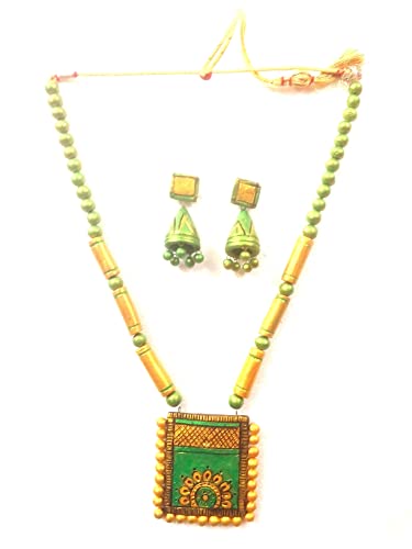 Karru Krafft Women's Handcrafted Terracotta Necklace Set Traditional Green Hand Painted Jewellery Set