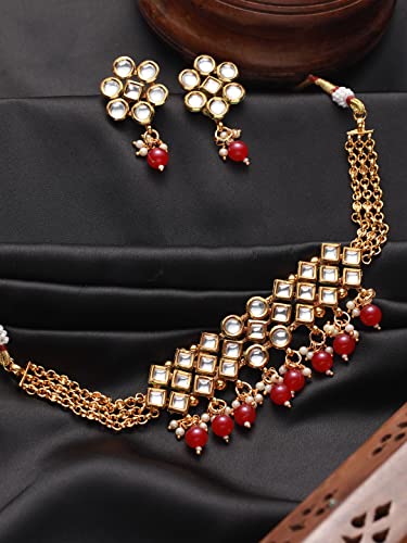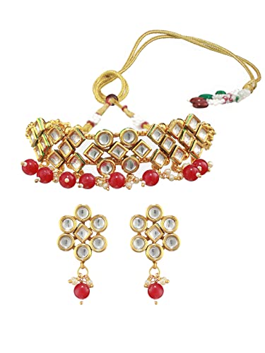 This gold-Colorjewellery set can be sed with a drawstring closure. This kundan pearl choker set is a sight to behold. This set will look great with ethnic and occasion wear.