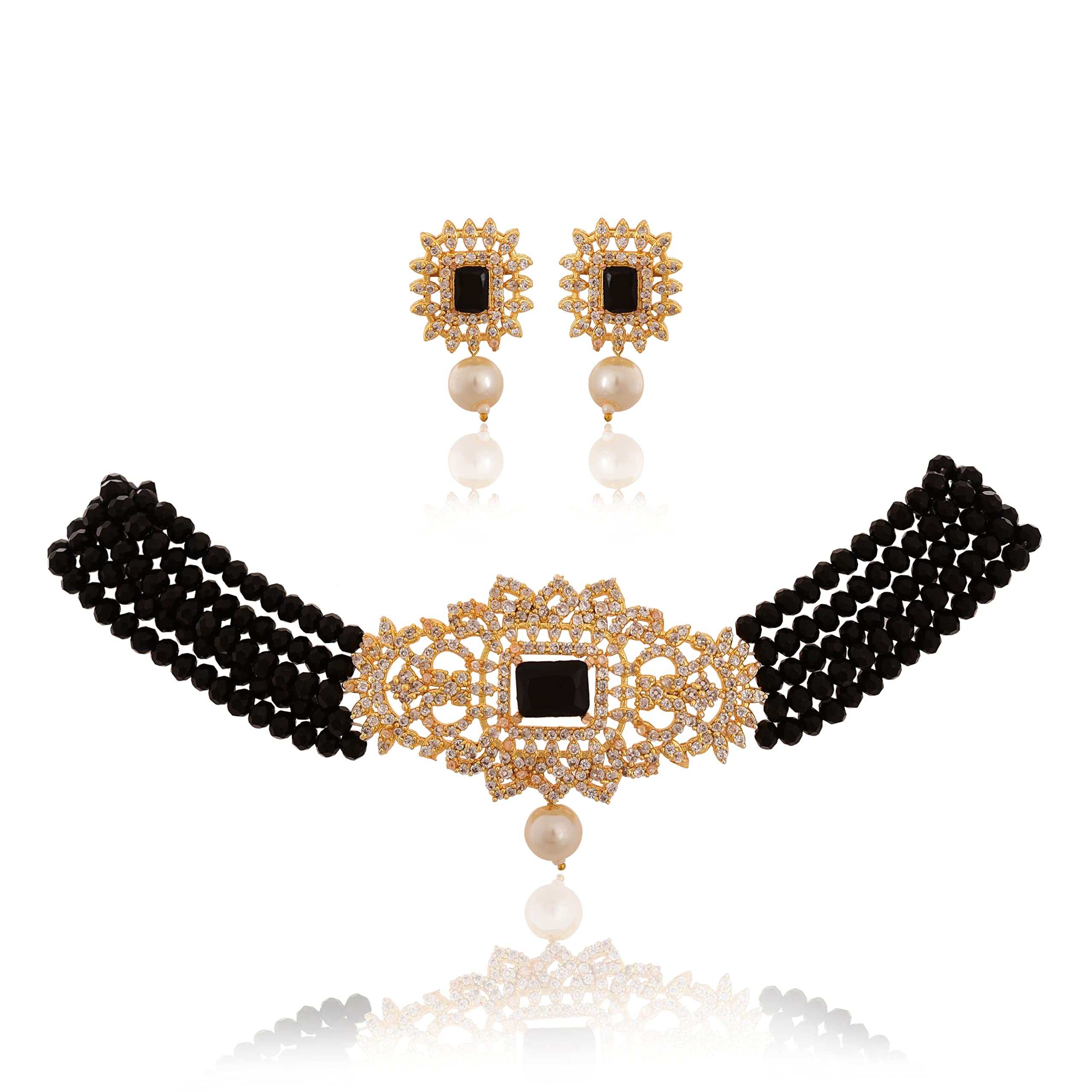 Whether You're attending a party or hosting an event this beautiful jewel Set from Tanusha Jewels is Something you need to take your look a step further. DESIGN : The Choker Features Stunning Square shaped designs which are perfect for days when you're looking for something a little different from your jewellery box . It is studded with beautiful white Zircon and crystal beads which will give your outfit that Extra fine look . JEWEL SET : This Jewel Set consists of a choker and a pair of beautiful earings which will look good when worn together . TYPE : Choker Set MATERIAL : Brass Base If You're a Choker Lover and you just Cannot get over it This one is for you . These Days most Women prefer to wear their chokers then Jewelleries .