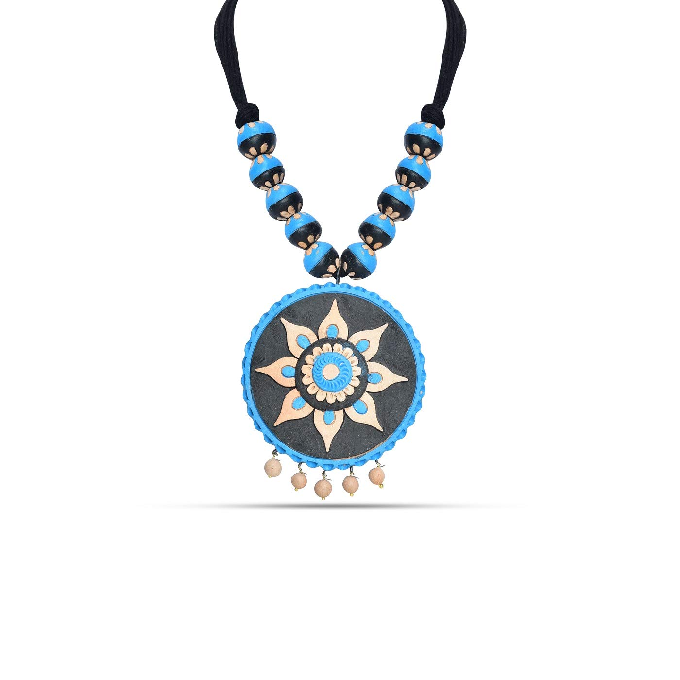 The product in display is made from terracotta material and is finished in an attractive black color. Furthermore this product features a strand shape and a design that renders it with the versatility to be worn as a festive occasion wear.