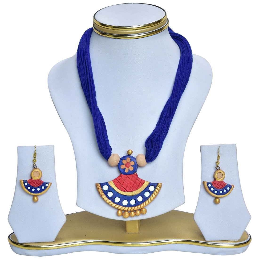 The product in display is made from terracotta material and is finished in an attractive blue color. Furthermore this product features a strand shape and a design that renders it with the versatility to be worn as a festive occasion wear.