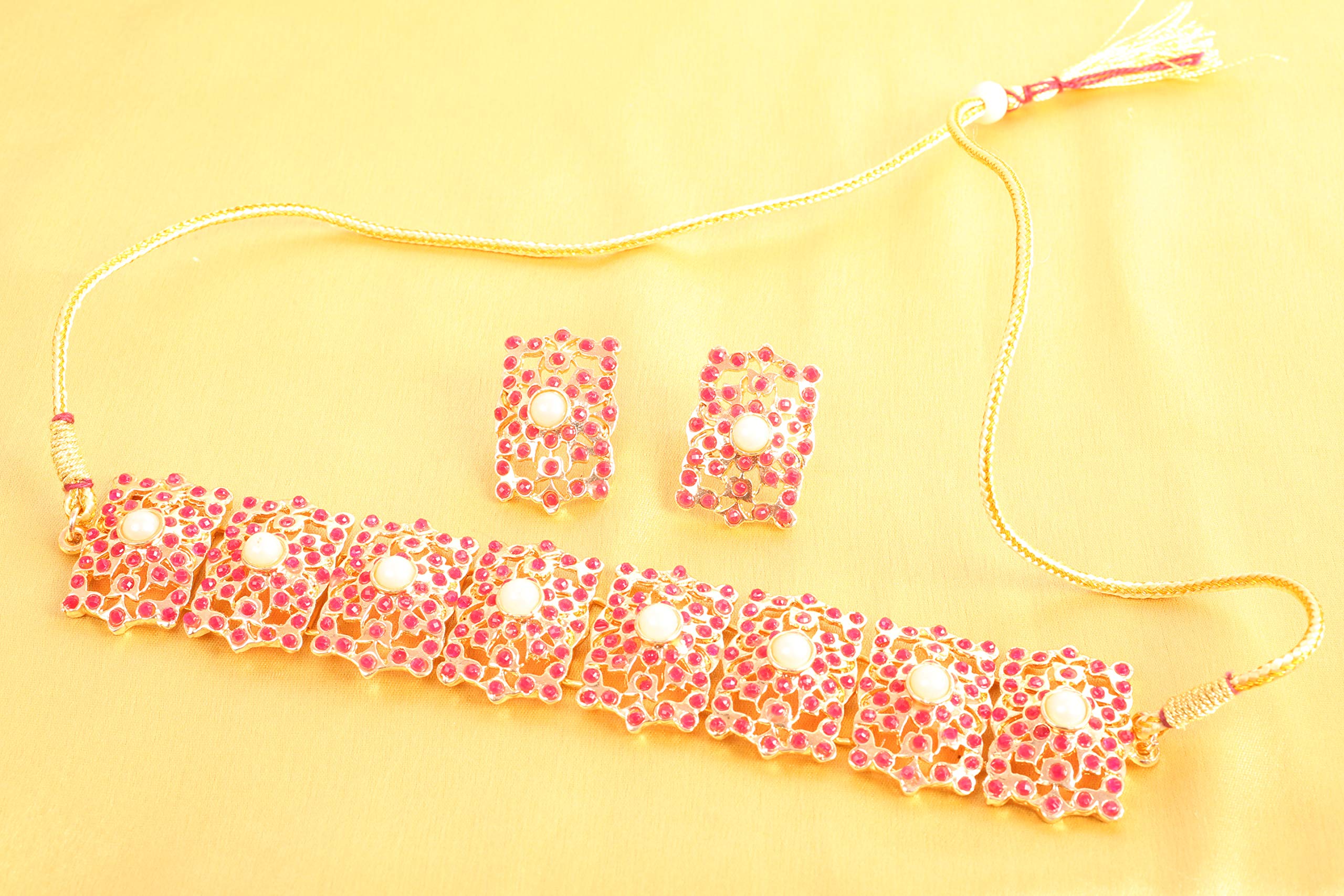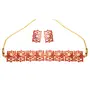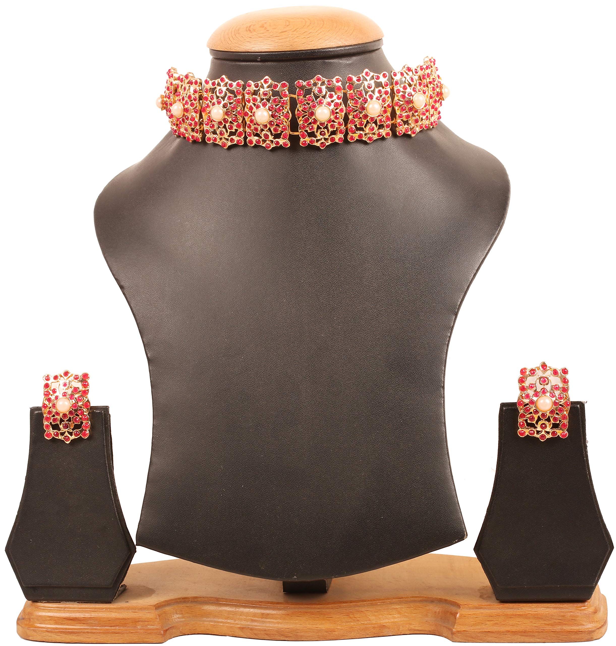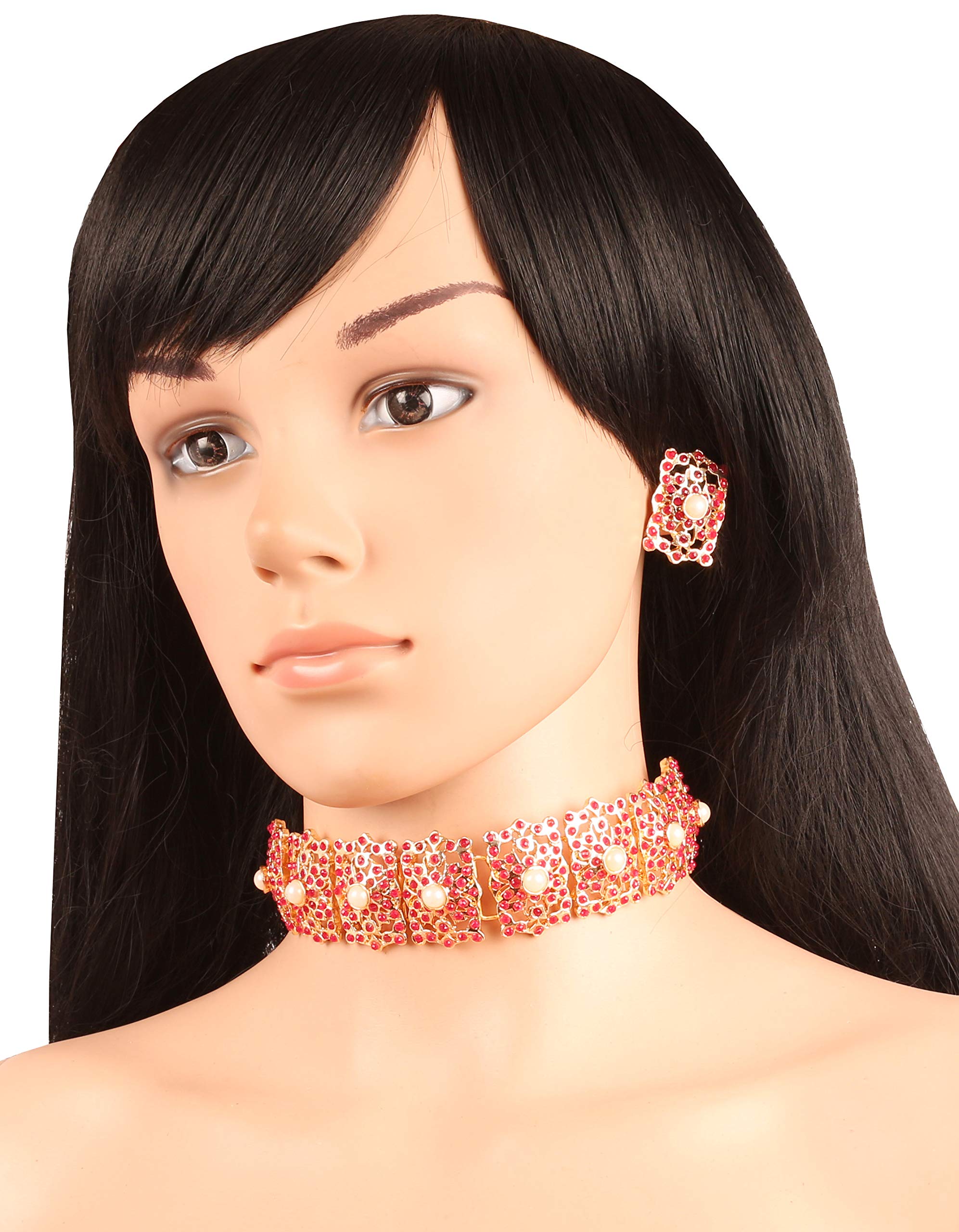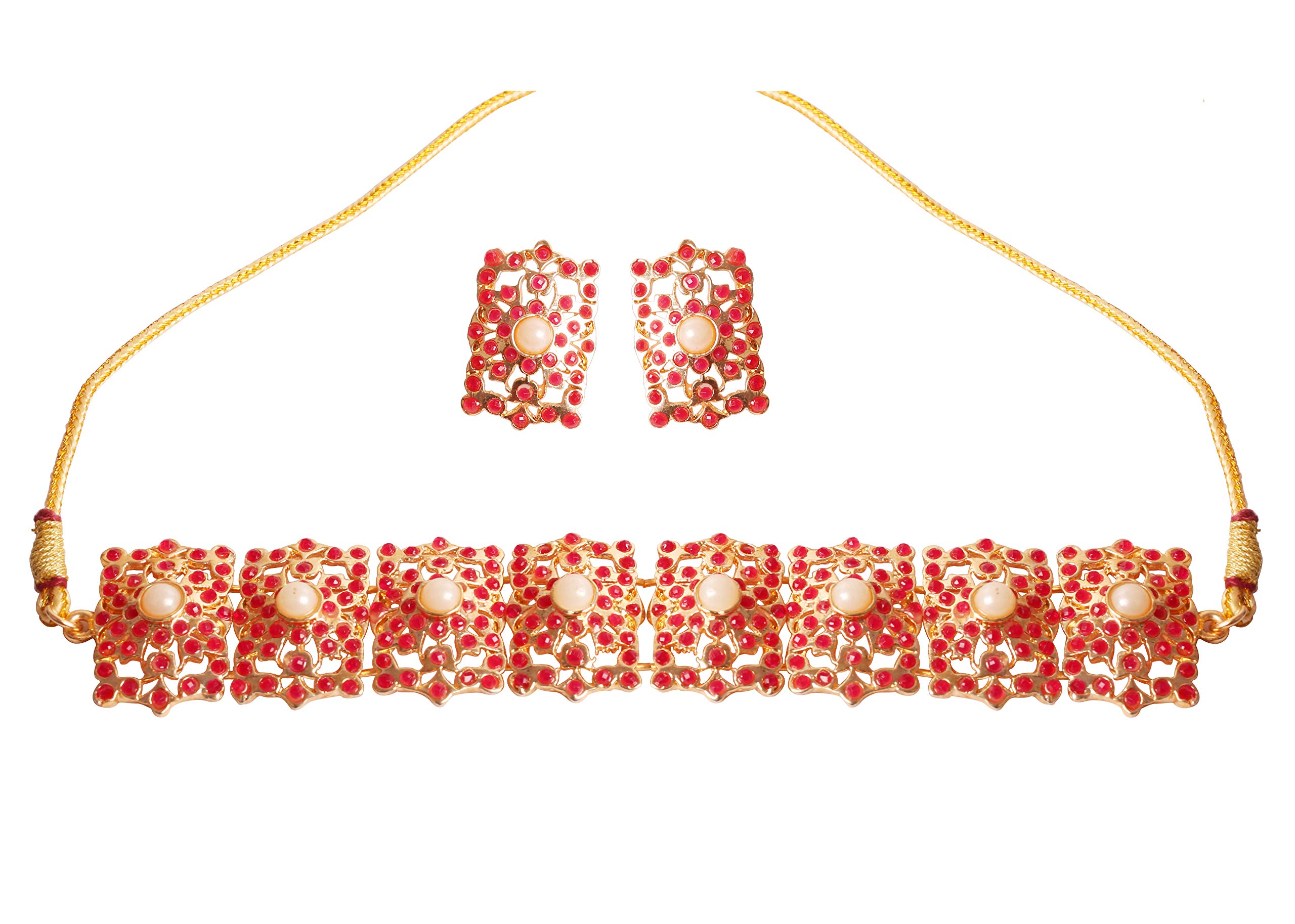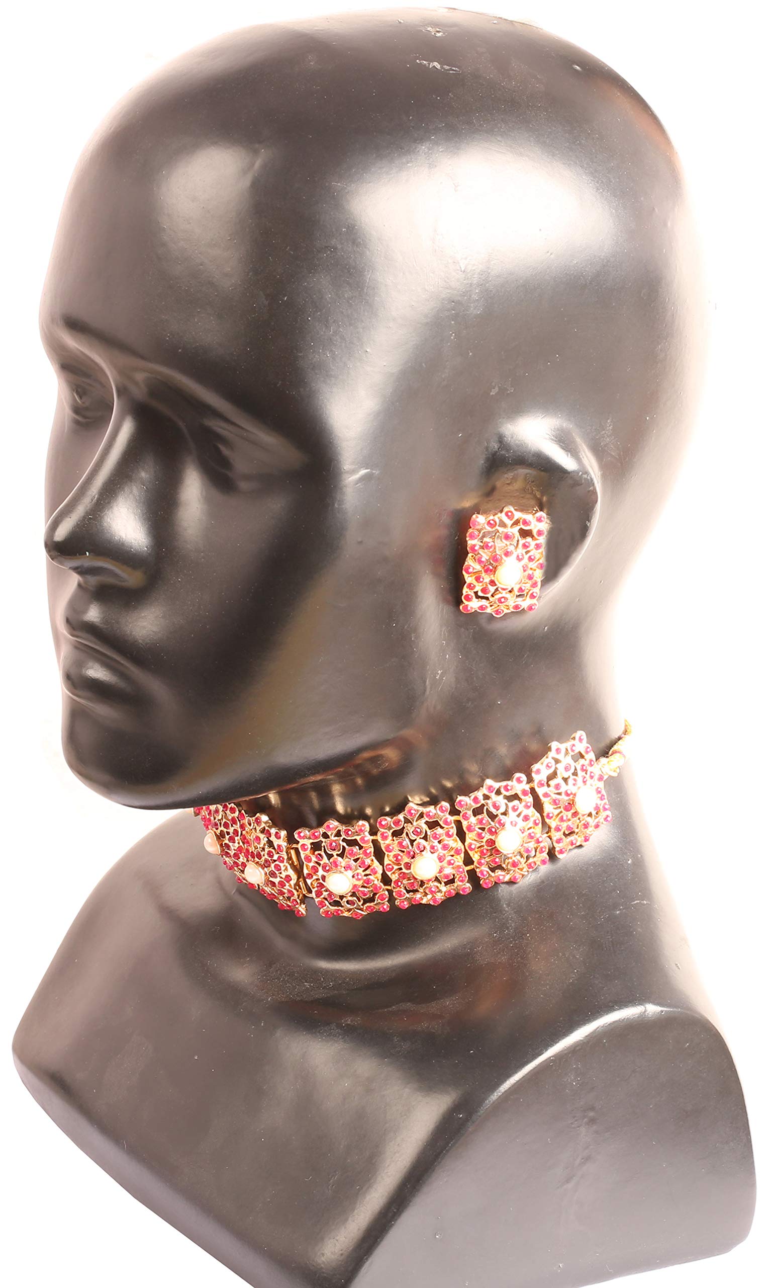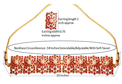 HomeFashionNecklaceTouchstone Indian Bollywood Mughal Era Inspired Mesh Work Faux Pearls Ruby Studded Look Designer Jewelry Chicpatti Necklace Set in Tone for Women.