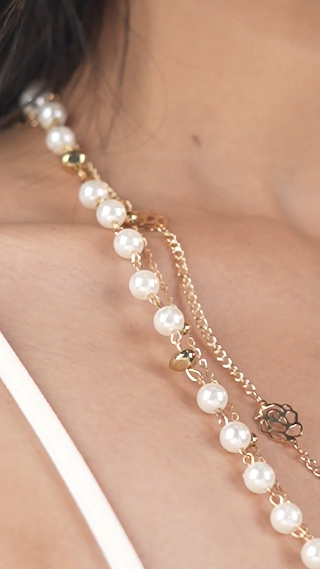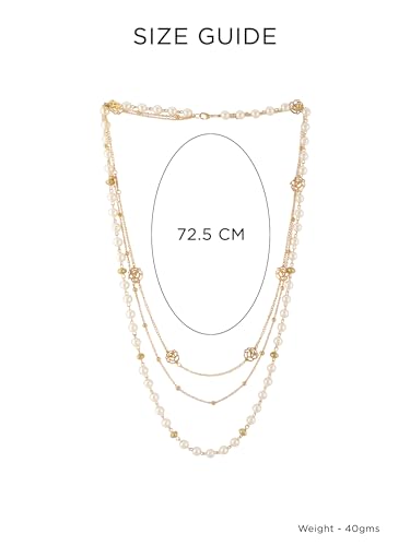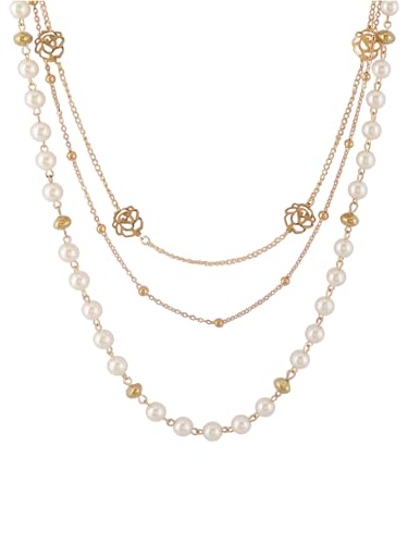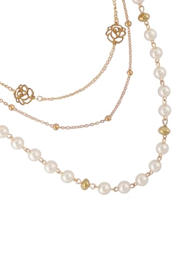 Women's Long Chain Necklace Pearl Necklace Multilayer Gold-Plated Floral Chain Necklace and White