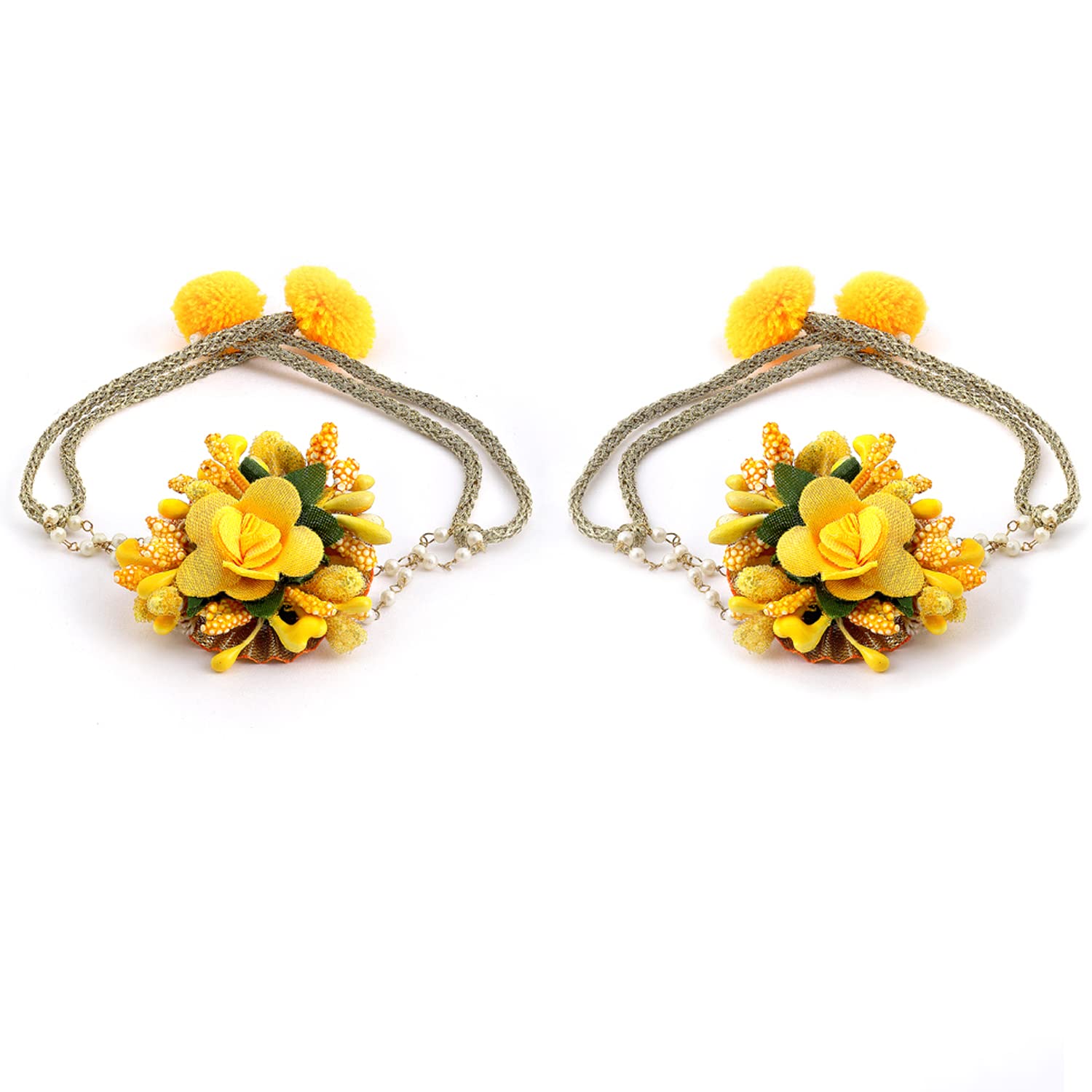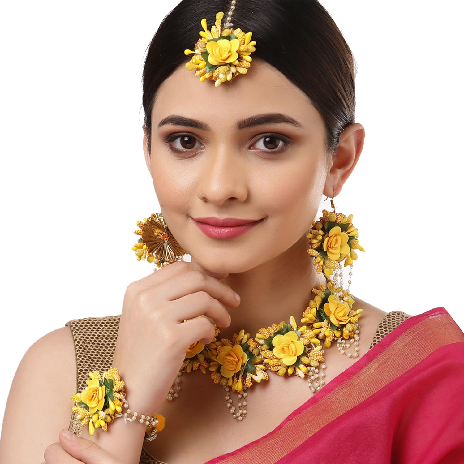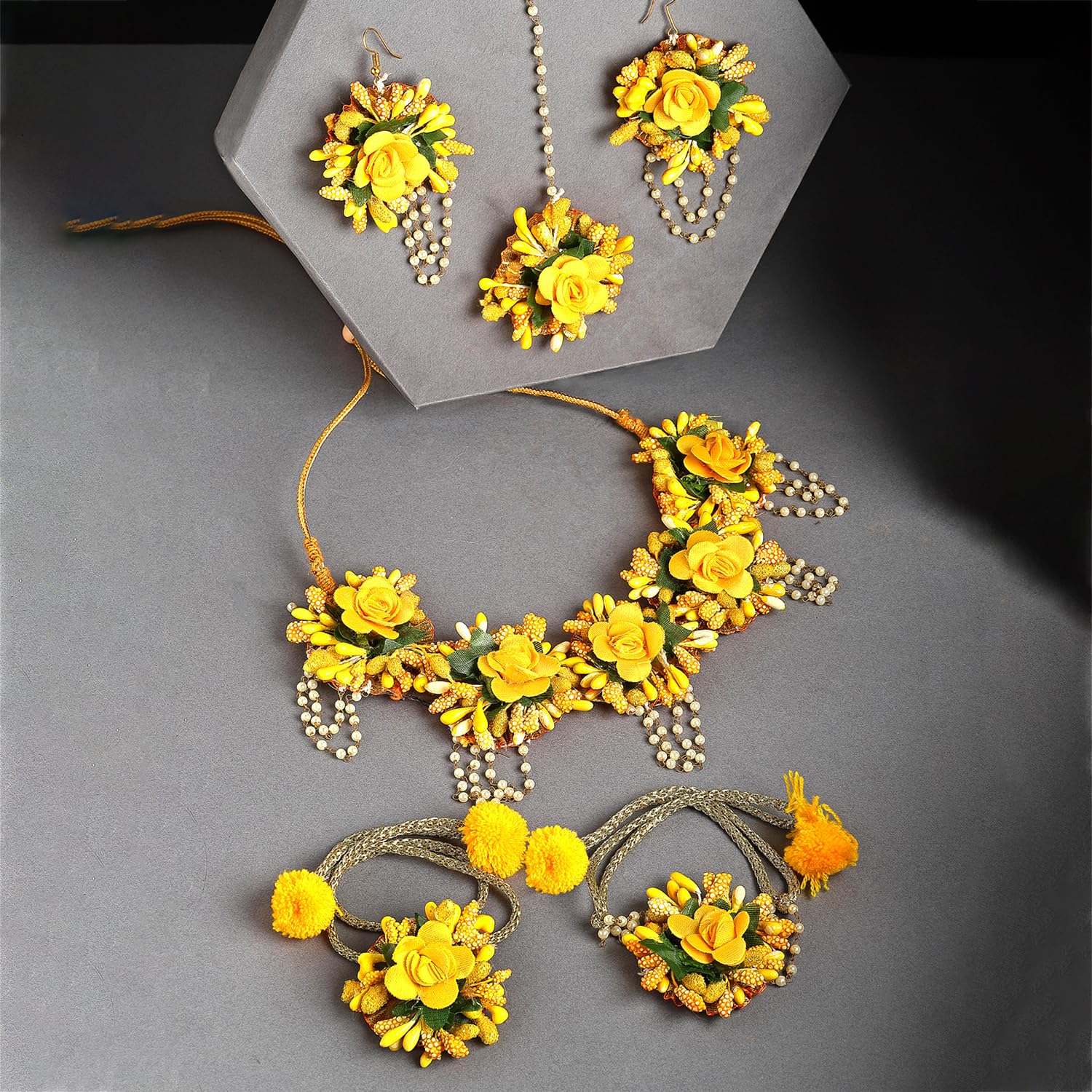 ZENEME Jewellery Flowers Jewellery Set For Haldi Gota Patti Necklace Earrings Bracelet & Maang Tika for Women & Girls (Mehandi/Haldi/Wedding/Bridal/Baby Shower)