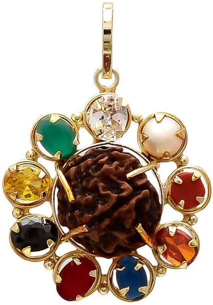 Beautifully Handcrafted Navratna Pendant With 5 Mukhi Rudraksha For Health,Wealth & Good Fortune