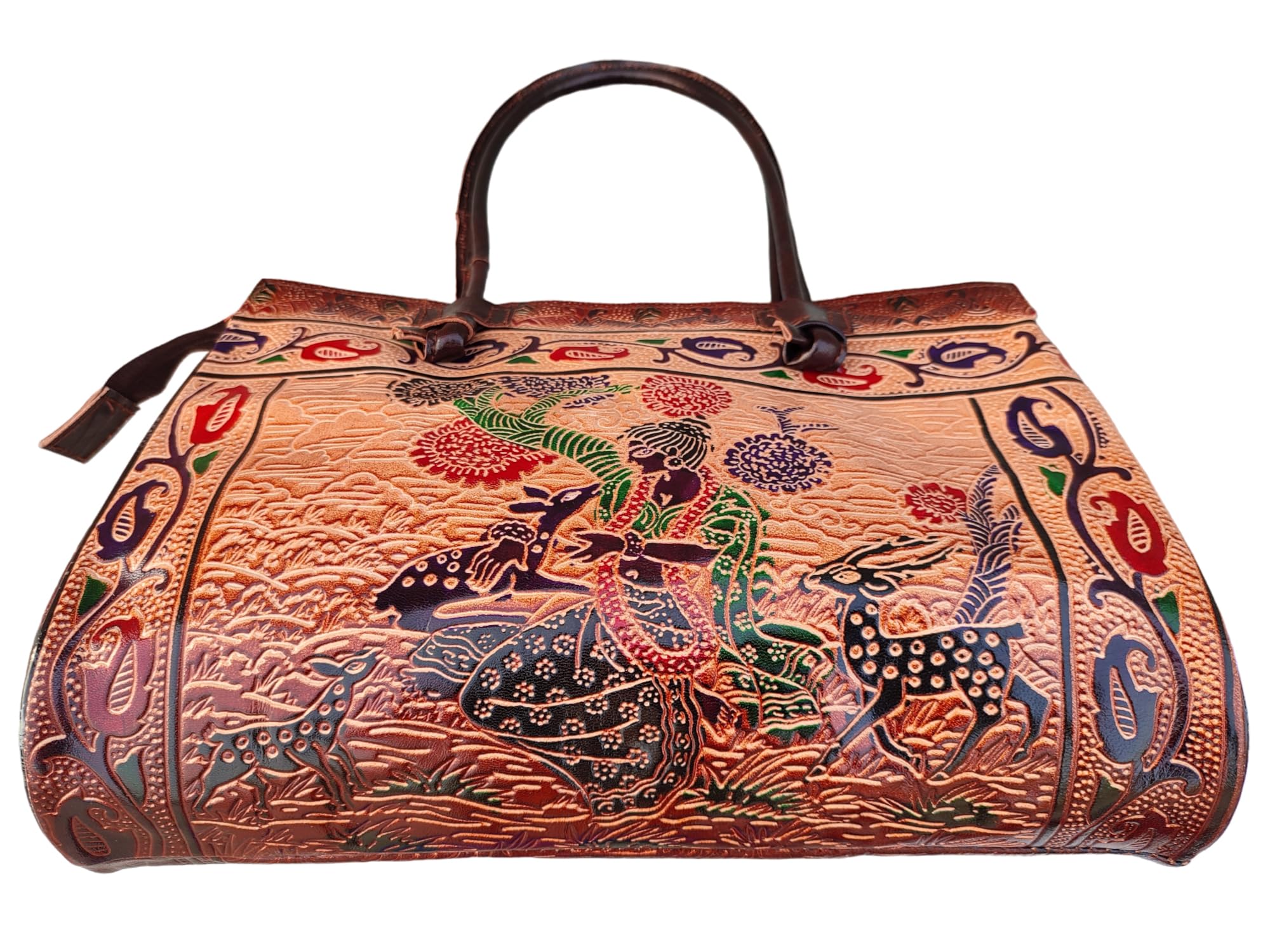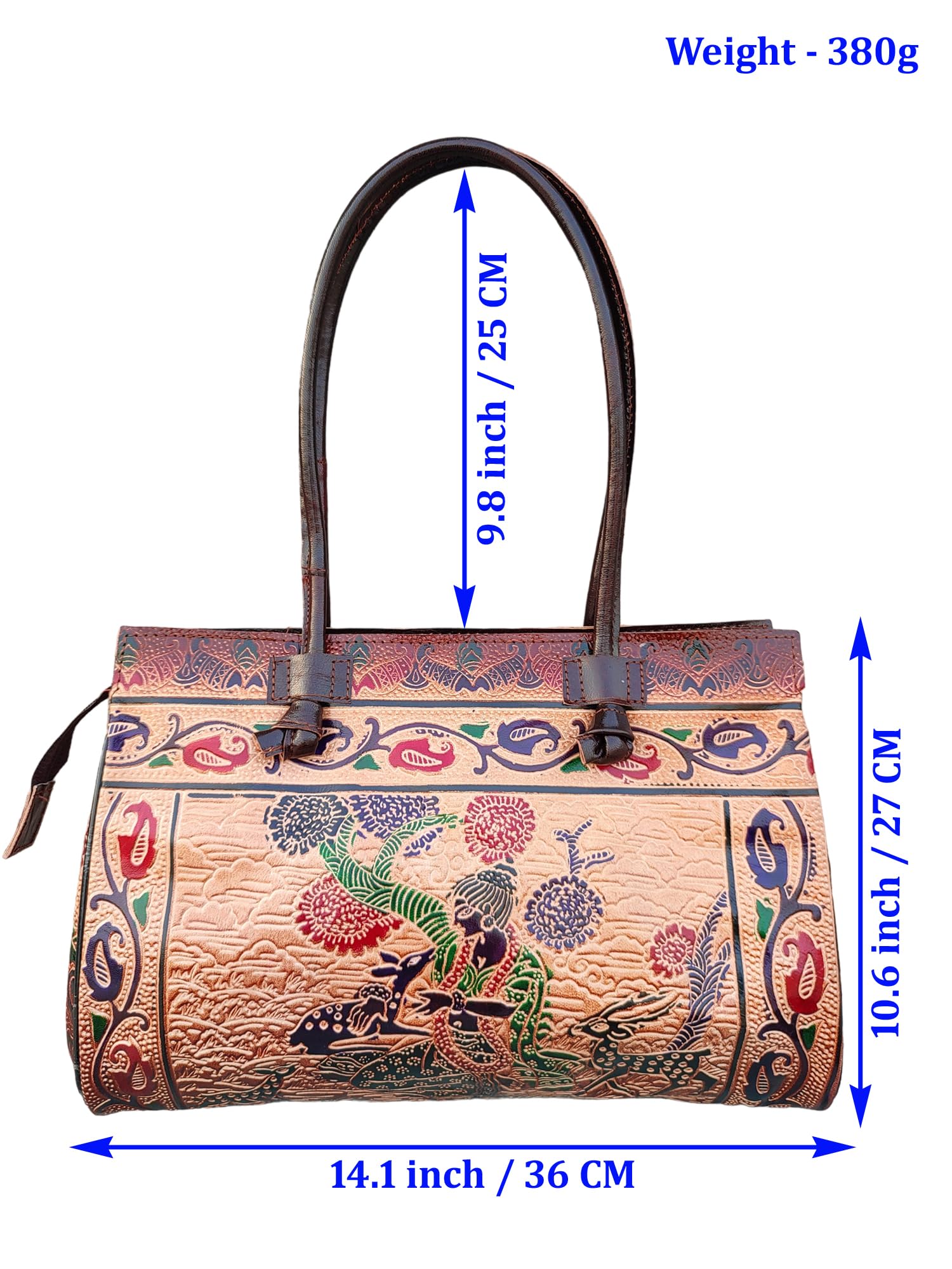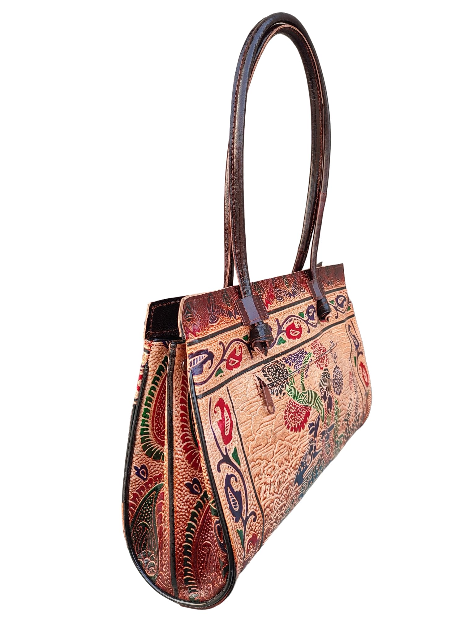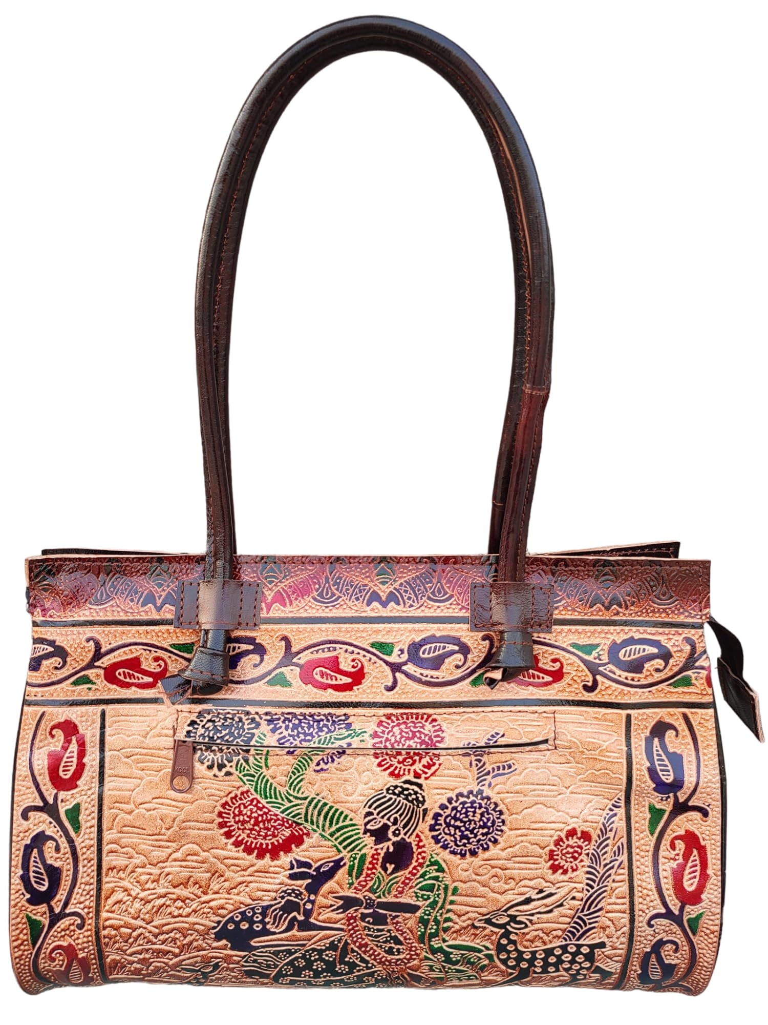 Handcrafted from Genuine Leather a Beautiful Ethnic Art of West Bengal. Design on Both Sides Double Shoulder Tote Handle One Main Zipper compartment One Zipper pocket in Back and Three Compartments inside Two zipper and One open cell phone compartment. Closes fully with zip. Traditional Block print. This purse is a classic example of age old Shantiniketan craft which was introduced in West Bengal India during the 1940s. The traditional motifs used for these Shantiniketan bags depict the rich cultural heritage of India. The Shantiniketan style evolved as a result of the Art Movement and these products have now become world famous for their appliqu batik and embossed craft work. The process of burnishing the leather gives it an elegant sheen and brings out the colors. The major embossing craft is done by hand and is an intricate process. After the final leather made it is then stitched into the desired product coated with a lacquer finish for making the product shiny and long lasting. We are happy for your interest SHANTINIKETAN EMBOSSED LEATHER PRODUCTS and artist of Shantinikan thanks to you.