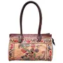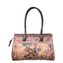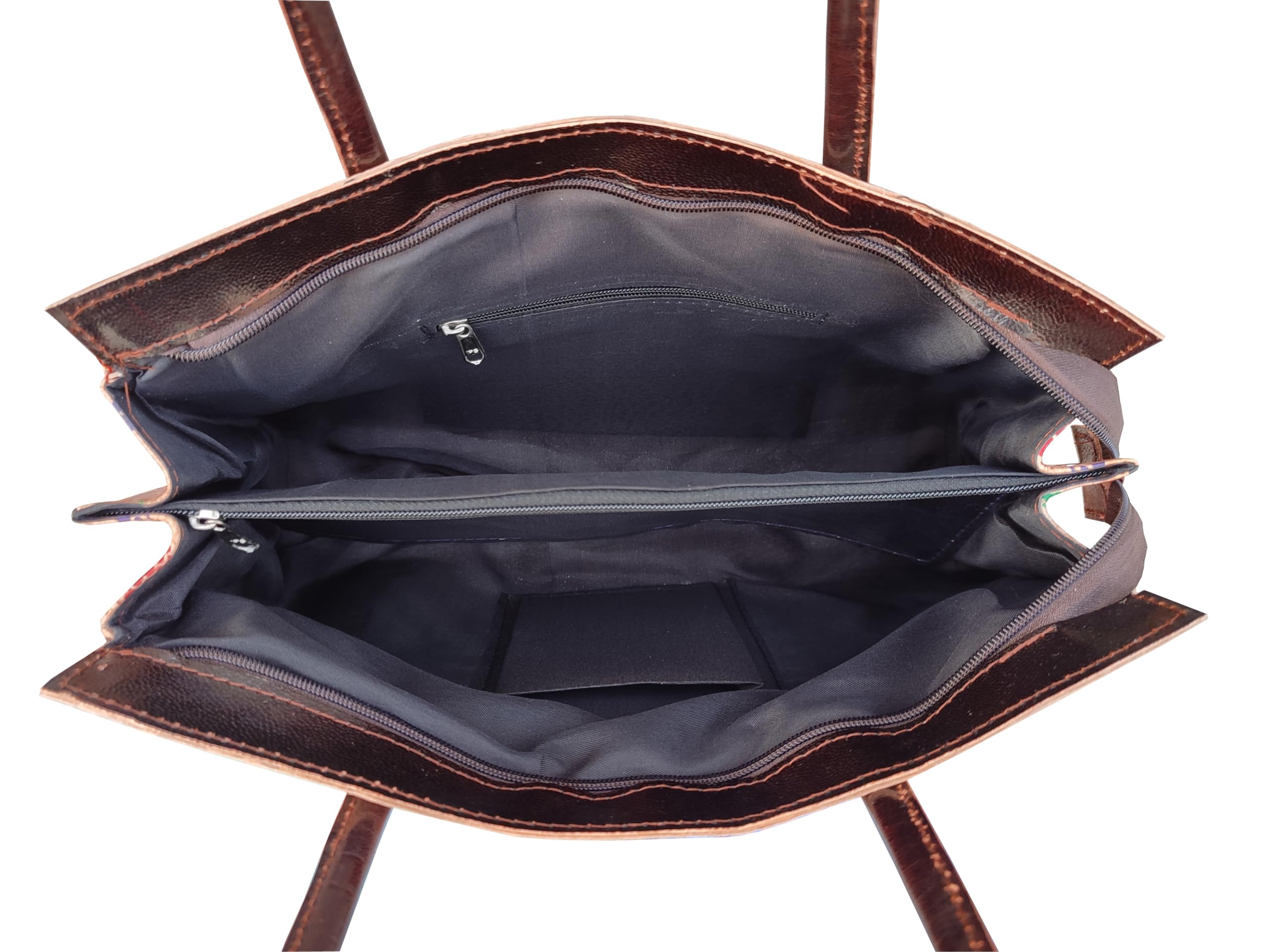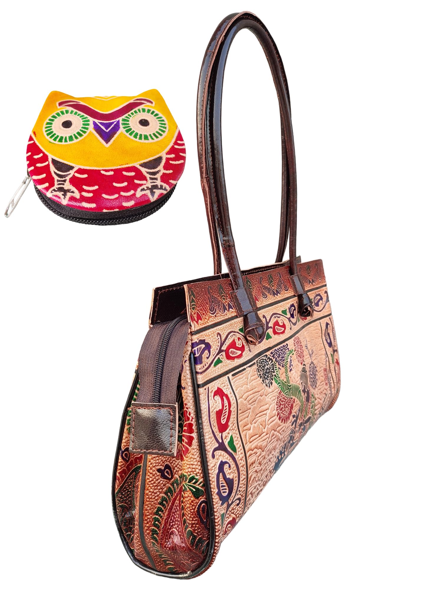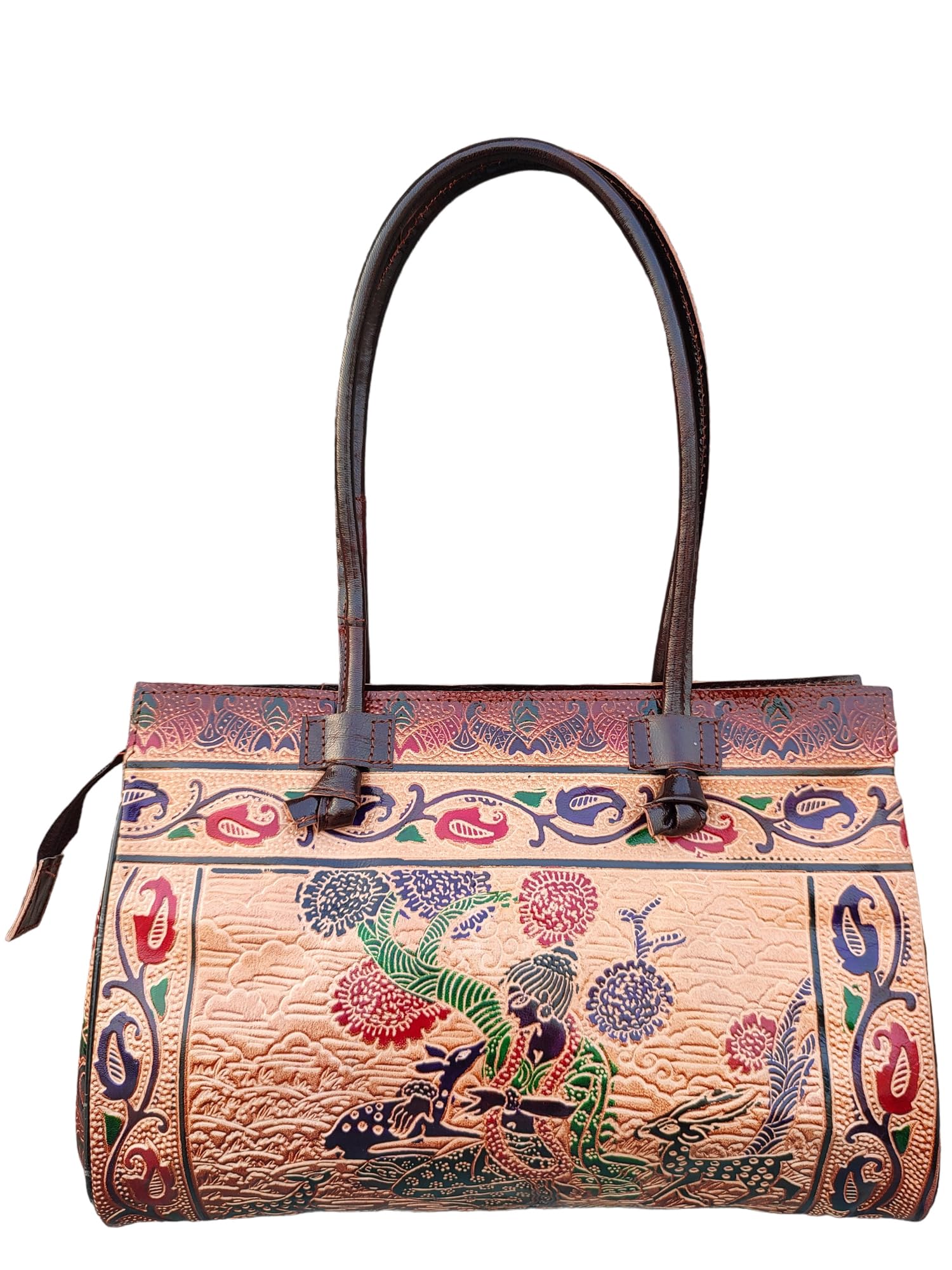 Handcrafted from Genuine Leather a Beautiful Ethnic Art of West Bengal. Design on Both Sides Double Shoulder Tote Handle One Main Zipper compartment One Zipper pocket in Back and Three Compartments inside Two zipper and One open cell phone compartment. Closes fully with zip. Traditional Block print. This purse is a classic example of age old Shantiniketan craft which was introduced in West Bengal India during the 1940s. The traditional motifs used for these Shantiniketan bags depict the rich cultural heritage of India. The Shantiniketan style evolved as a result of the Art Movement and these products have now become world famous for their appliqu batik and embossed craft work. The process of burnishing the leather gives it an elegant sheen and brings out the colors. The major embossing craft is done by hand and is an intricate process. After the final leather made it is then stitched into the desired product coated with a lacquer finish for making the product shiny and long lasting. We are happy for your interest SHANTINIKETAN EMBOSSED LEATHER PRODUCTS and artist of Shantinikan thanks to you.