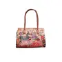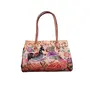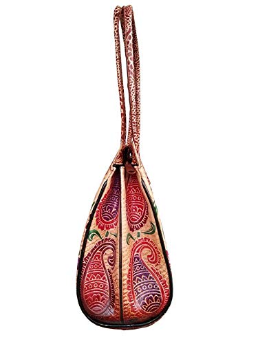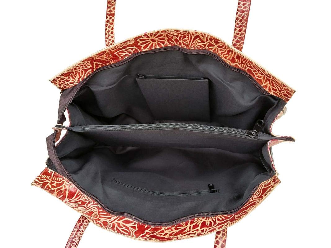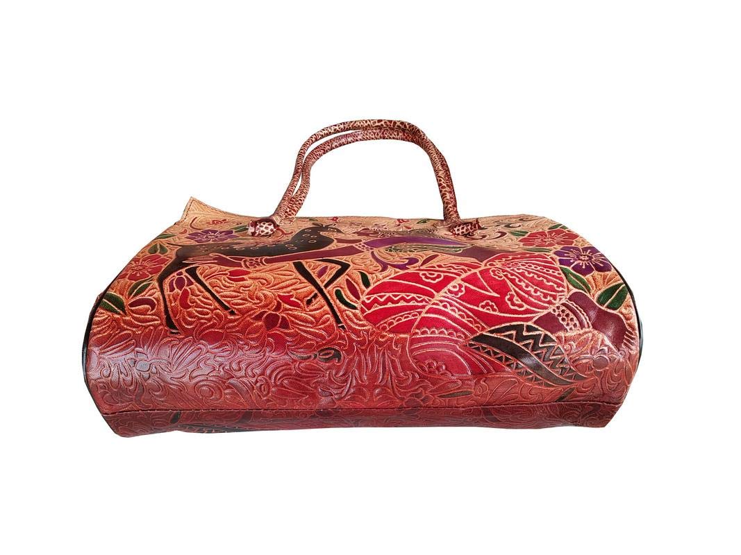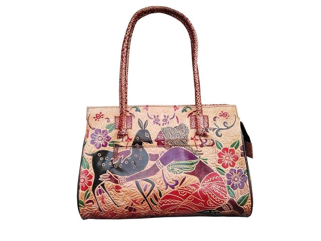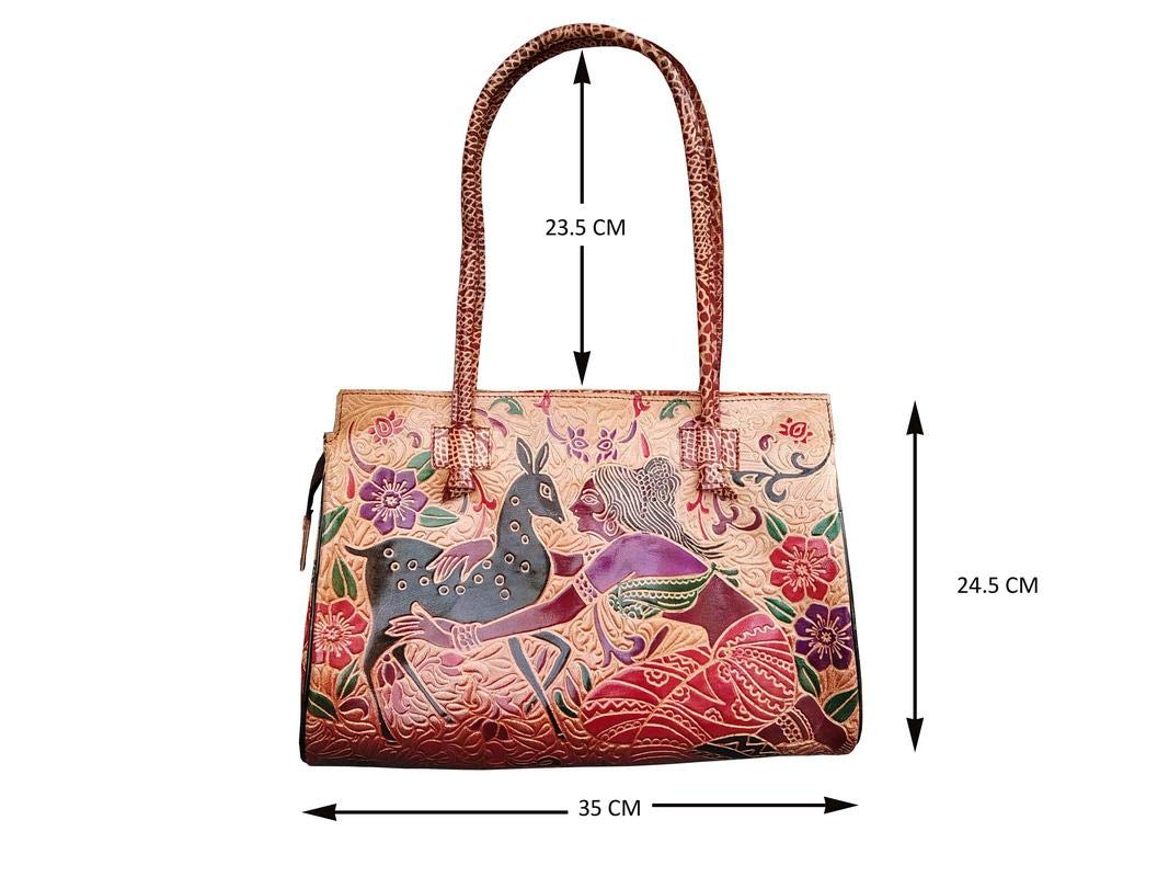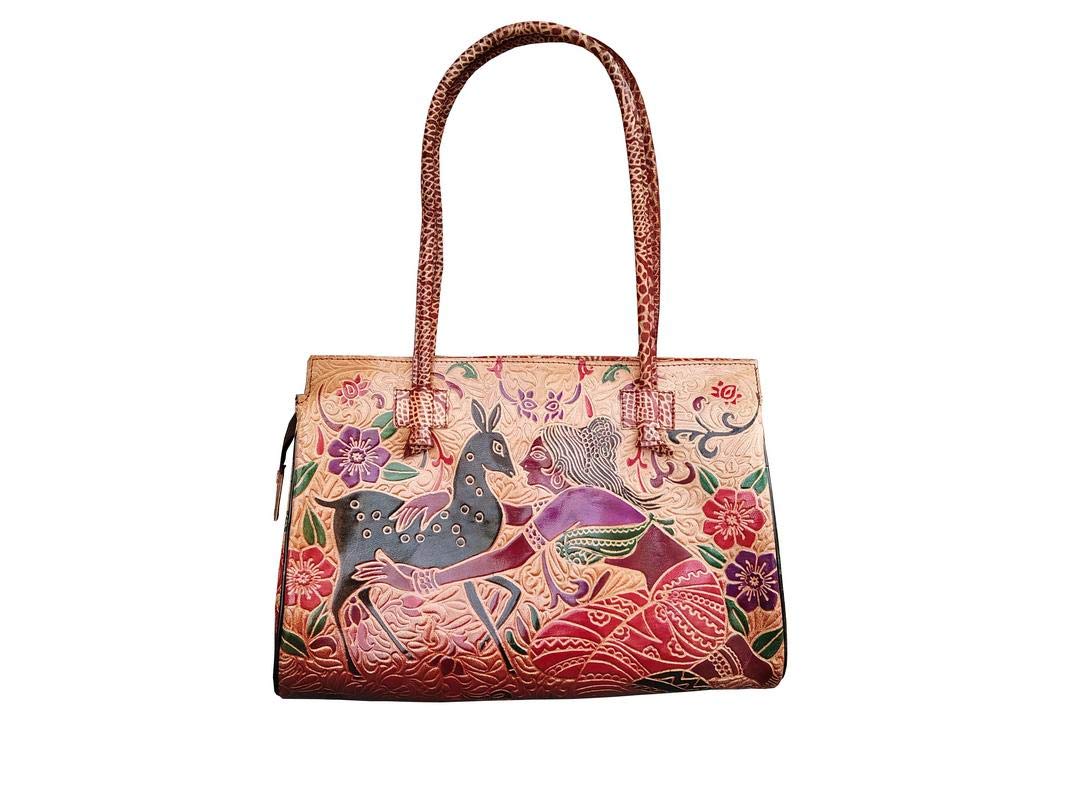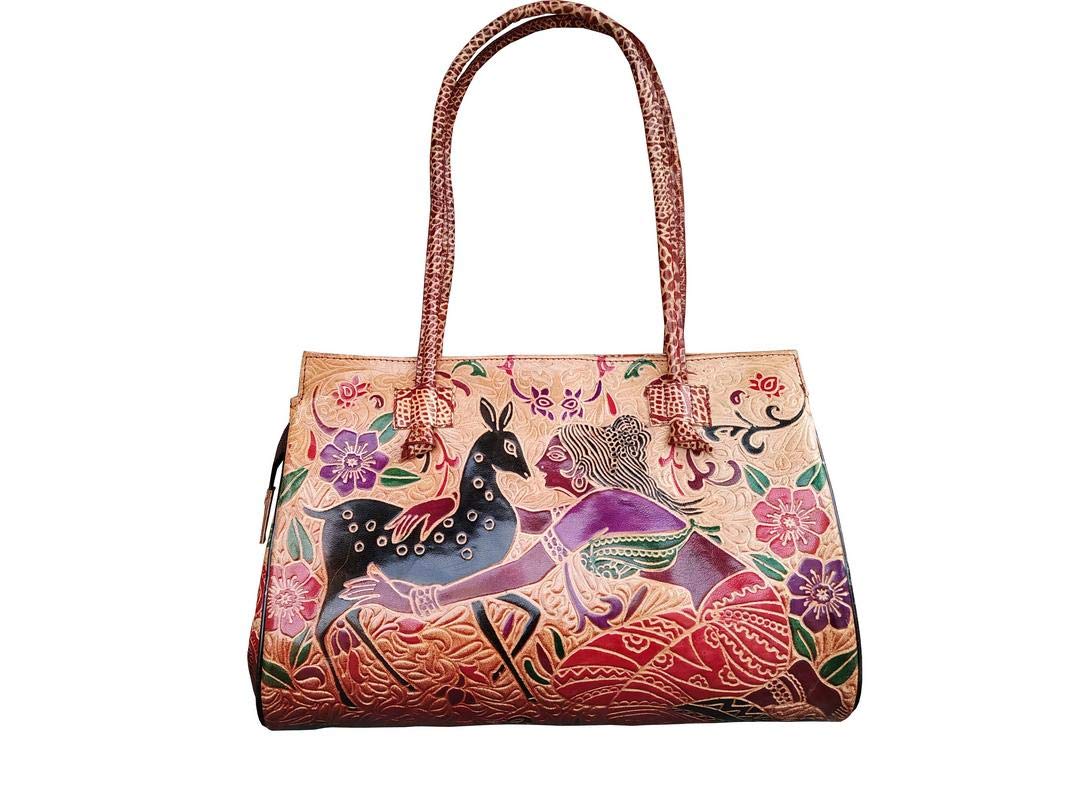 Handcrafted from Leather a Beautiful Ethnic Art of West Bengal. Design on Both Sides Double Shoulder Tote Handle One Main Zipper compartment One Zipper pocket in Back and Three Compartments inside Two zipper and One open cell phone compartment. Closes fully with zip. Traditional Block print. This purse is a classic example of age old Shantiniketan craft which was introduced in West Bengal India during the 1940s. The traditional motifs used for these Shantiniketan bags depict the rich cultural heritage of India. It derives its name from the place where it was first introduced - Shantiniketan and was patronized by Nobel Laureate Rabindra Nath Tagore who revived a number of crafts that were nearing redundancy in Shantiniketan. The Shantiniketan style evolved as a result of the Art Movement and these products have now become world famous for their applique batik and embossed craft work. The process of burnishing the leather gives it an elegant sheen and brings out the colors. The major embossing craft is done by hand and is an intricate process. After the final leather made it is then stitched into the desired product coated with a lacquer finish for making the product shiny and long-lasting.