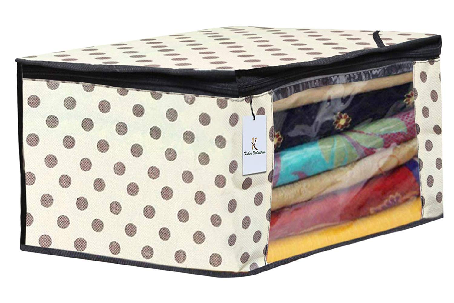 Material: Non Woven Color: Cream & White. Design- Polka Dot .Package Contents: 6 Piece Saree Cover .Size: 43 cm x 35 cm x 22 cm .Made from durable wear and tear-resistant non-woven fabric. Lightweight and flexible saree covers .Carefully stitched to offer additional strength. Ideal for storing sarees and protecting them from dust and insects .Transparent see-through window for easy identification of contents. Durable zipper for easy opening and closing.