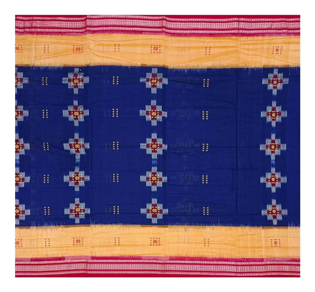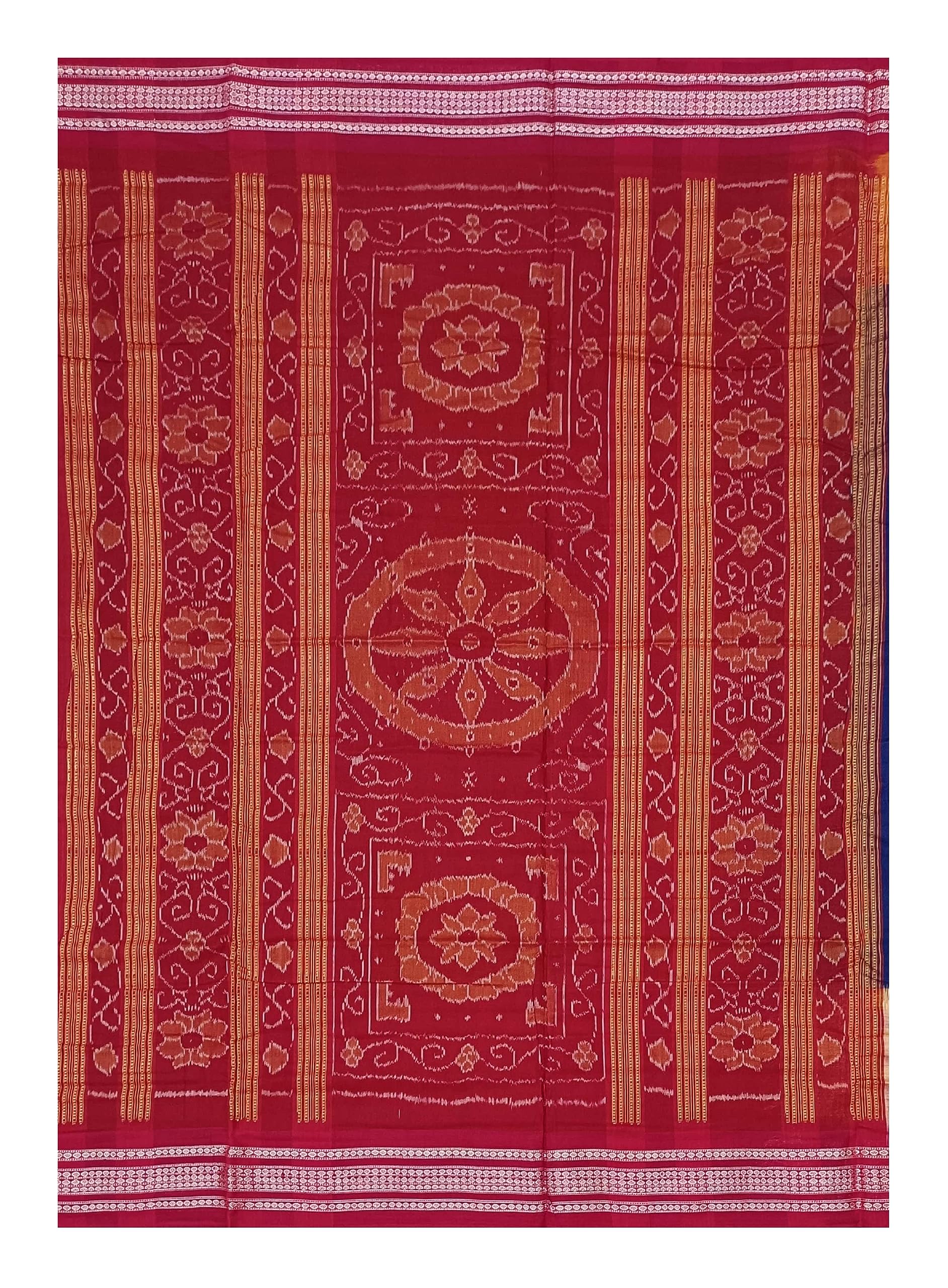 SAMBALPURI BANDHA CRAFT sambalpuri bomkai cotton saree with blouse piece(Pasapali design in blue red and light peach colors combination)