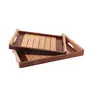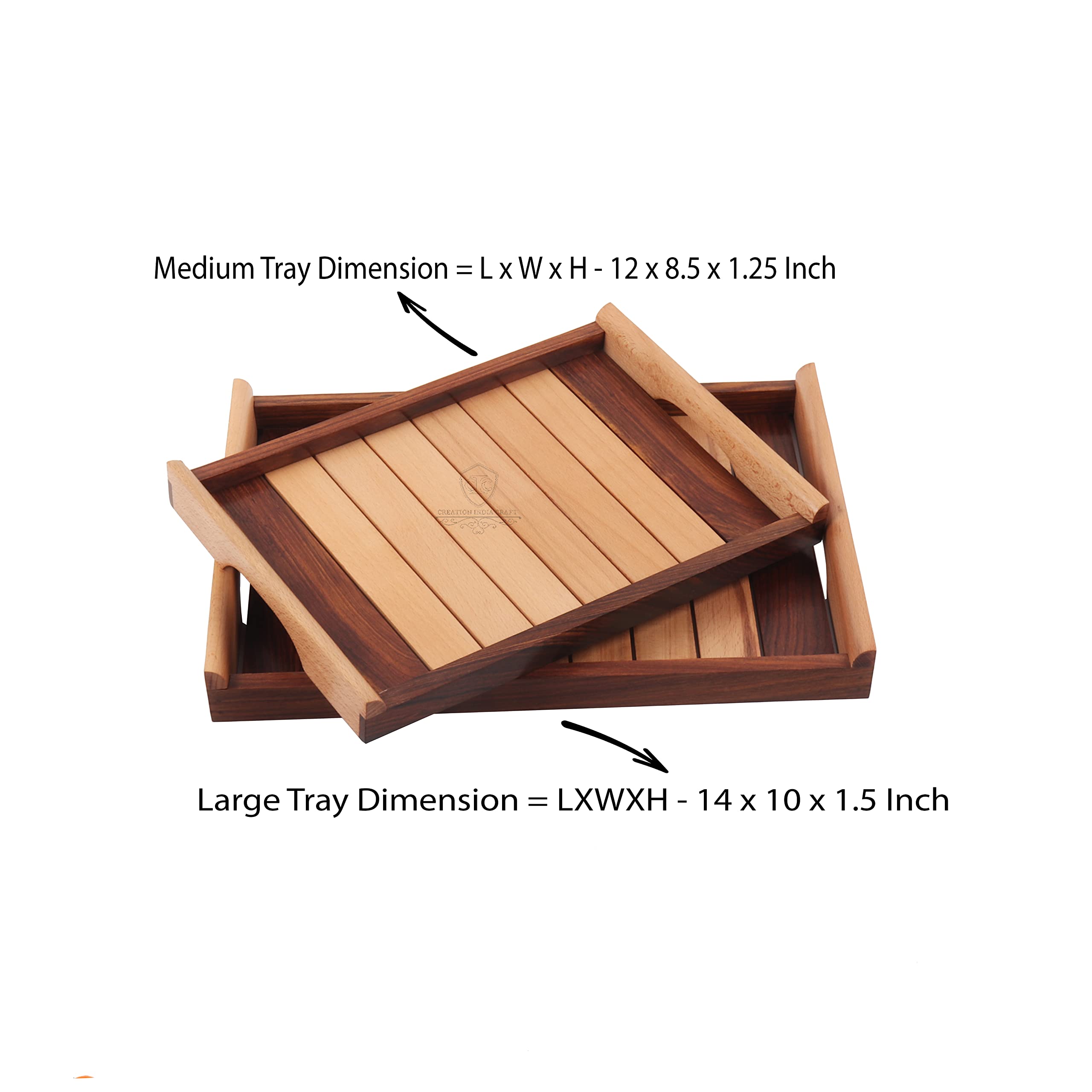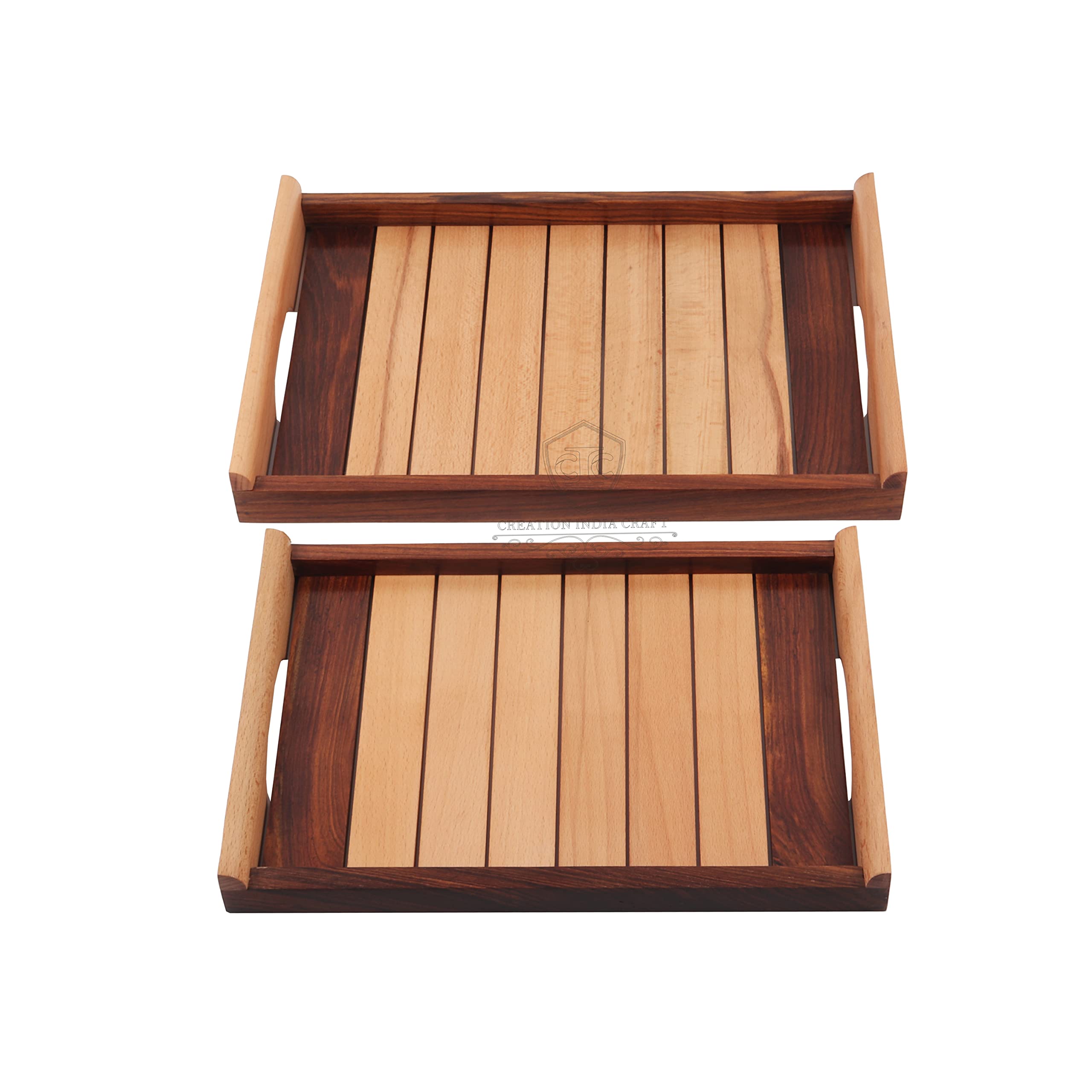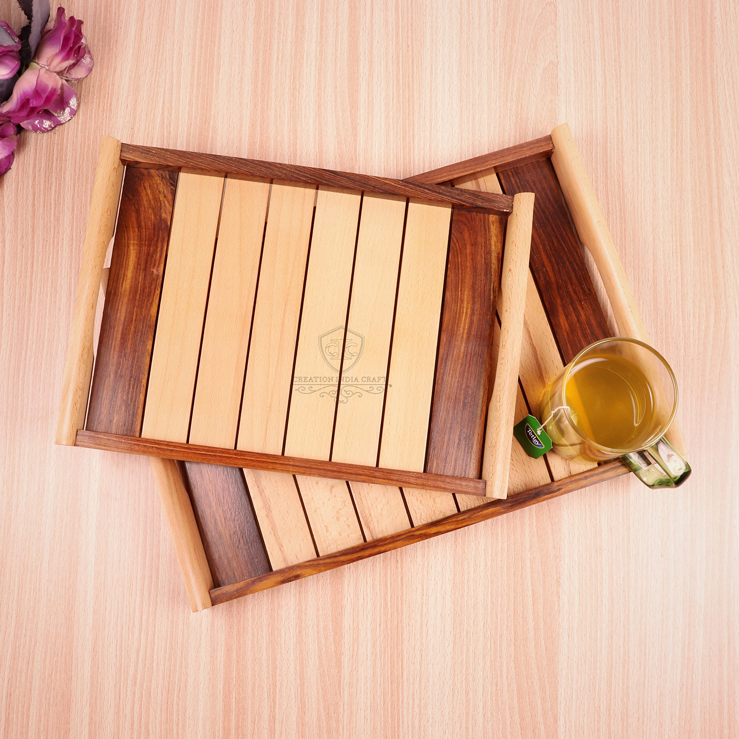 This Stylish & Unique colour pattern different look coffee table tray can easily become a focal point of the living room. In addition to serving hot beverages and snacks they are perfect for all occasions.It is designed for everyday use and can be used as a snack tray drinks tray kitchen tray appetiser tray nesting tray home decor displays party platter and tray. Who doesn't love breakfast in bed? It's something everyone enjoys and it's made that much easier and relaxing with a great set of serving trays. Whether you're delivering juice and eggs or would prefer to carry drinks outside for guests these trays are just the thing for your home. The wood used is called Hand printed /wood in India and is one of the finest available in the Indian forests. Constructed from premium quality wooden material this tray is highly durable in nature. This tray is very elegant in design with strips on the surface that adds a distinctive and classy touch when kept on the dining table. The handles are given a curved finish which reflects sophistication. These trays make serving tea snacks coffee finger foods cakes cheeses slices of bread and crackers great for parties and events. This wooden tray is ideal for serving food decorating your home and cutting clutter in any space.