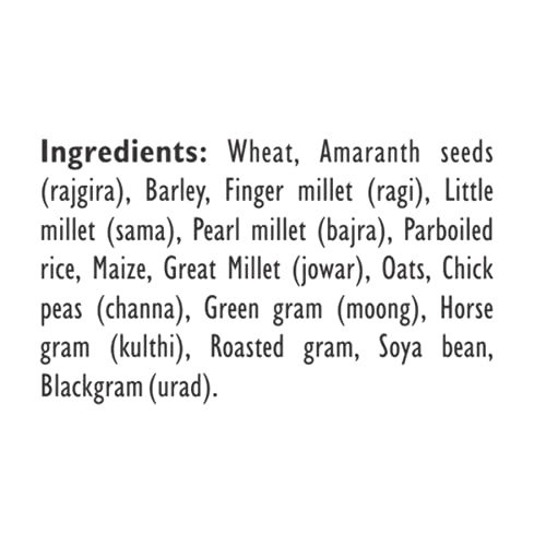 Wheat Amaranth seeds (rajgira) Barley Finger millet (ragi) Little millet (sama) Pearl millet (bajra) Parboiled rice Maize Oats Great Millet (jowar) Chick peas (channa) Green gram (moong) Horse gram (kulthi) Roasted gram Soya bean Black gram (urad).