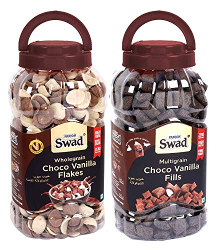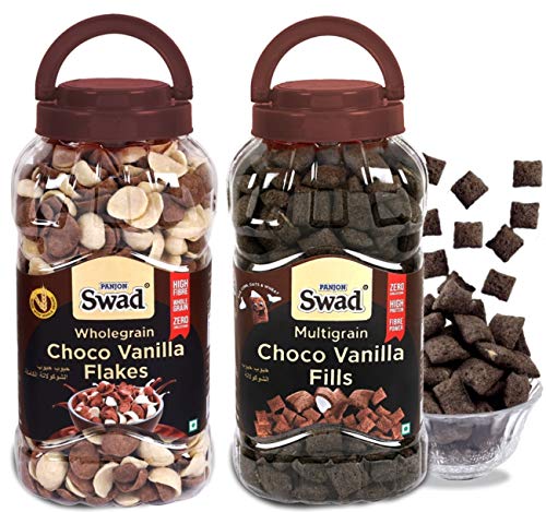 Flavor name:Choco Vanilla Flakes & Choco Vanilla FillsSwad Choco Vanilla Flakes & Choco Vanilla Fills (Wholegrain Double Chocolate Breakfast Cereal ) 2 Jars 720 g. Swad presents its exclusive range of Tasty & Healthy Breakfast Cereals.Swad 2 combo Jars Choco Vanilla Fills & Choco Vanilla Flakes & Choco Vanilla Fillsis made with the Goodness of Multigrains in a Zero Cholesterol formula to keep you charges up all day long. 100% Natural Ingredients Multigrain Power No Preservatives Rich in Fibre Vitamins Iron & High in Protein. It tastes great with hot or cold milk yoghurt ice creams or enjoy it as a snack with children kids friends & family. Available in 12 unique flavours: Corn Flakes Honey Cornflakes Flakes Vanilla Flakes Diet Muesli Muesli Fruit & Nut Chocolate Fills Vanilla Fills Strawberry Fills & Fruit Rings & Fruit Balls. Swad Fruit Rings & Choco Fills Combo of 2 Jars [ Fill and Frooty Breakfast Cereal for Children] Try all 12 Swad Breakfast Cereals to experience Tastier & Healthier Breakfast every day.