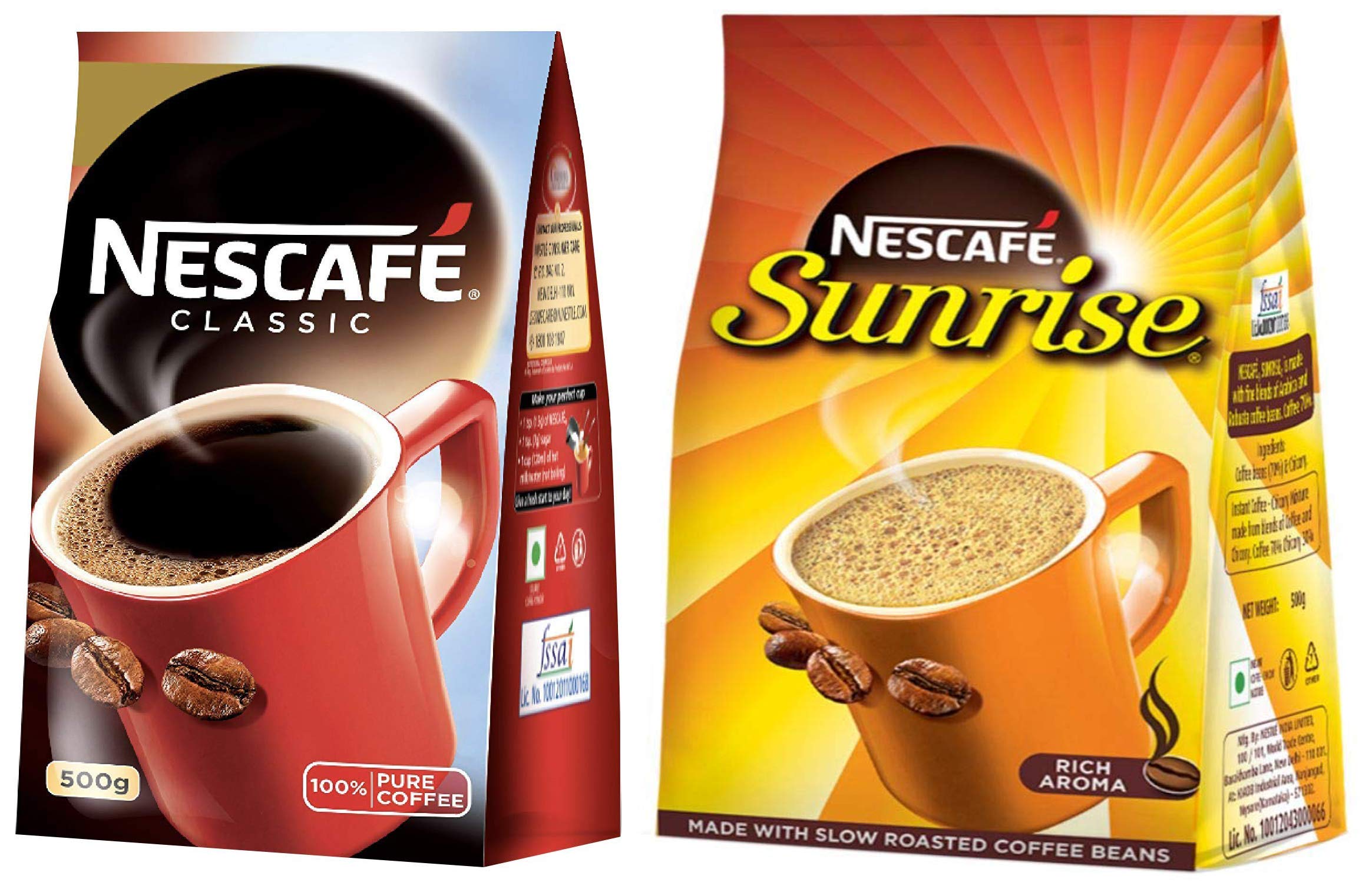 Nescafe Classic Coffee 500g Stabilo PackTo take your coffee experiences to the next level NESCAFE the world's favourite instant coffee brand brings forth a rich and aromatic coffee in the form of NESCAFE Classic. The unmistakable flavour of NESCAFE Classic is what makes this signature coffee so loved all over the world. Start your day right with the first sip of this classic 100% pure coffee and let the intense taste and wonderfully refreshing aroma of NESCAFE instant coffee awaken your senses to new opportunities. With over 75 years of experience and working with coffee farmers to help them grow more sustainable coffee through improved crop techniques we deliver the best coffee produced by the best selecting roasting and blending methods. Usage: Simply follow the instructions on the back of the pack and mix the coffee powder with hot water or milk to get your own cup of premium instant coffee right at home. Storage Recommendation: On opening transfer the contents of the pack into an airtight container. Always use a dry spoon.Nescafe Sunrise Rich Aroma 500gNESCAFe Sunrise is an instant coffee-chicory mixture made from 70% coffee powder and 30% chicory. This instant coffee is made with the fine blends of Arabica and Robusta coffee beans from the farms of South India. These beans are slow roasted in rotating drum roasters till they develop the perfect aroma. Nestleâs world class technology then ensures this aroma is retained all through the coffee making process and finally capture in aroma granules. This soluble coffee is easy to use ensuring coffee-making doesnât seem like an inconvenience. So rise up to the awakening taste and rich aroma of NESCAFe Sunrise coffee and let new opportunities come to you. THE NESCAFe PLAN: We are committed to using sustainable processes in our coffee production and taking care of our planet by introducing better farming techniques. Nescafe works directly with 170000 coffee farmers every year and helps them grow better quality delicious coffee which leads to increase in their income. Usage: Simply follow the instructions on the back of the pack and mix the coffee granules to hot water sugar and milk to release the rich aroma in your cup every morning. Storage Recommendation: Do store the instant coffee powder in a cool dry and hygienic place. To ensure lasting freshness transfer the contents into an airtight container. Always use a dry spoon.