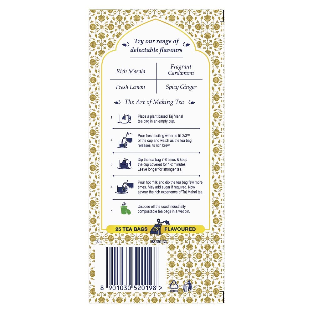 The Aromatique Experience The Brooke Bond Taj Mahal teabag range contains the finest teas blended with delicious aromatic spice flavours to treat your senses to a perfect harmony of flavour and spice. Go ahead and indulge in the carefully crafted Fragrant Cardamom flavour combined with Taj's signature tea - for an experience that makes you go - Wah Taj!. Freedom of ChoiceWith Brooke Bond Taj Mahal Tea bags you enjoy the freedom to conveniently choose the tea that you want. Choose from a range of Indian flavors - Spicy Ginger Fragrant Cardamom Rich Masala and Fresh Lemon. You may like to try Taj Mahal Honey & Lemon Green Tea bags as well.Constructed with careAt Brooke Bond Taj Mahal we pay attention to every detail in our commitment to excellence so that you can savour the best. Even in how our tea bags are constructed. We make them from a special kind of paper that does not disintegrate in water. Each bag is made as two chambers which ensures that more water can contact the tea within them and thus brew faster. Introducing tea bags also meant that a new blend had to be created that was suited for instant brewing