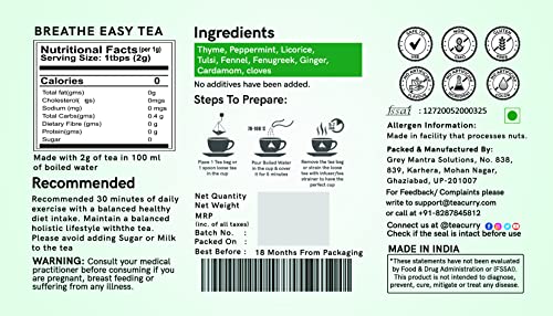 • 100% Natural Tea Aroma Clean Lungs - Teacurry 30 Day Lungs Cleanse tea consists of Black Licorice (mulethi) from Punjab Mighty Ginger variety from Orissa Krishna Tulsi from Sasangir Penang Cloves from Tamil Nadu Peppermint from Haryana Green Cardamom from