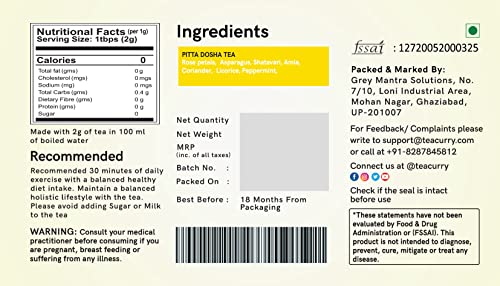 • 100% Natural Ingredients - Teacurry pitta herbal tea is a unique blend of Shatavari rose amla peppermint coriander and licoric. This tea contains only best and high grade natural ingredients and no added sugar or so it is the best tea for pitta dosha.