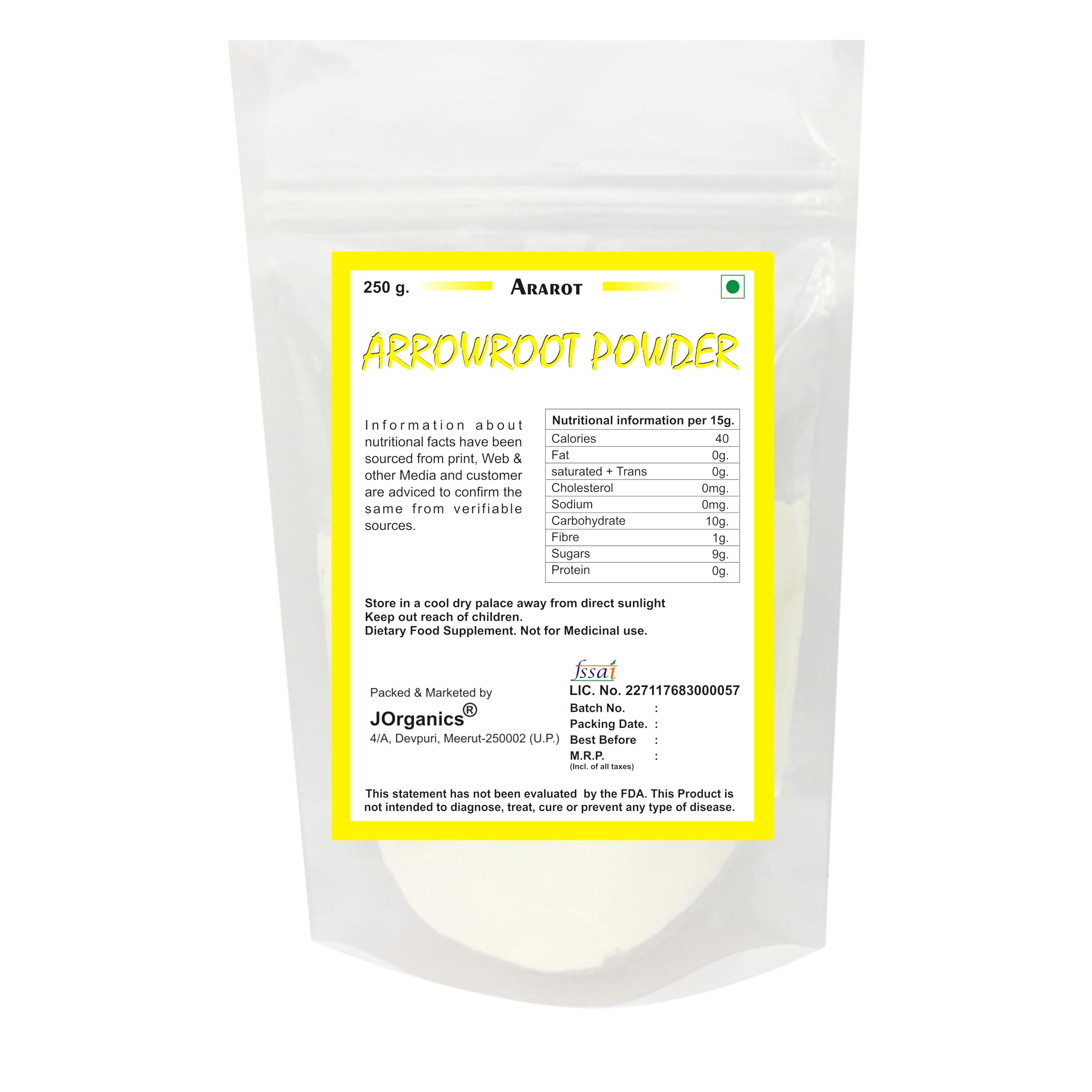 JOrganics 250g Natural Raw Arrowroot FlourPure organic and nutritious: Our arrowroot flour is made from 100% pure and organic arrowroot powder which is a gluten-free starchy flour that is naturally low in calories and fat. It is also a good source of fiber and minerals including potassium magnesium and phosphorus.Ideal for babies and adults: Arrowroot flour is a great choice for babies and adults who are looking for a healthy and nutritious alternative to wheat flour. It is easy to digest and does not contain any gluten making it a good choice for people with celiac disease or gluten intolerance. Arrowroot flour is also a good source of fiber which can help to regulate digestion and promote gut health.Useful in a variety of recipes: Arrowroot flour can be used in a variety of recipes including puddings pies gravies and other sauces. It can also be used as a thickener in soups and stews. Arrowroot flour is a good choice for gluten-free baking as it can be used to make cakes cookies and other baked goods that are both delicious and nutritious.Safe and side effect free: Arrowroot flour is safe for most people to consume and does not have any known side effects. It is a good choice for people who are looking for a natural and safe thickener for their food.Order your jar of JOrganics 250g Natural Raw Arrowroot Flour today and experience the benefits of this versatile and nutritious flour!