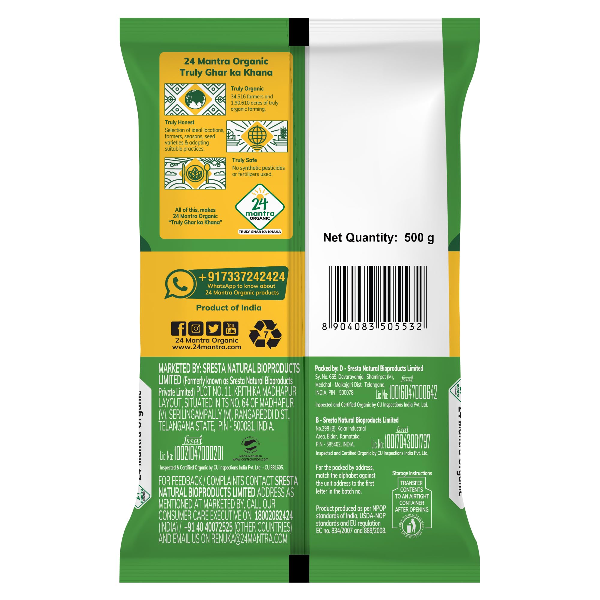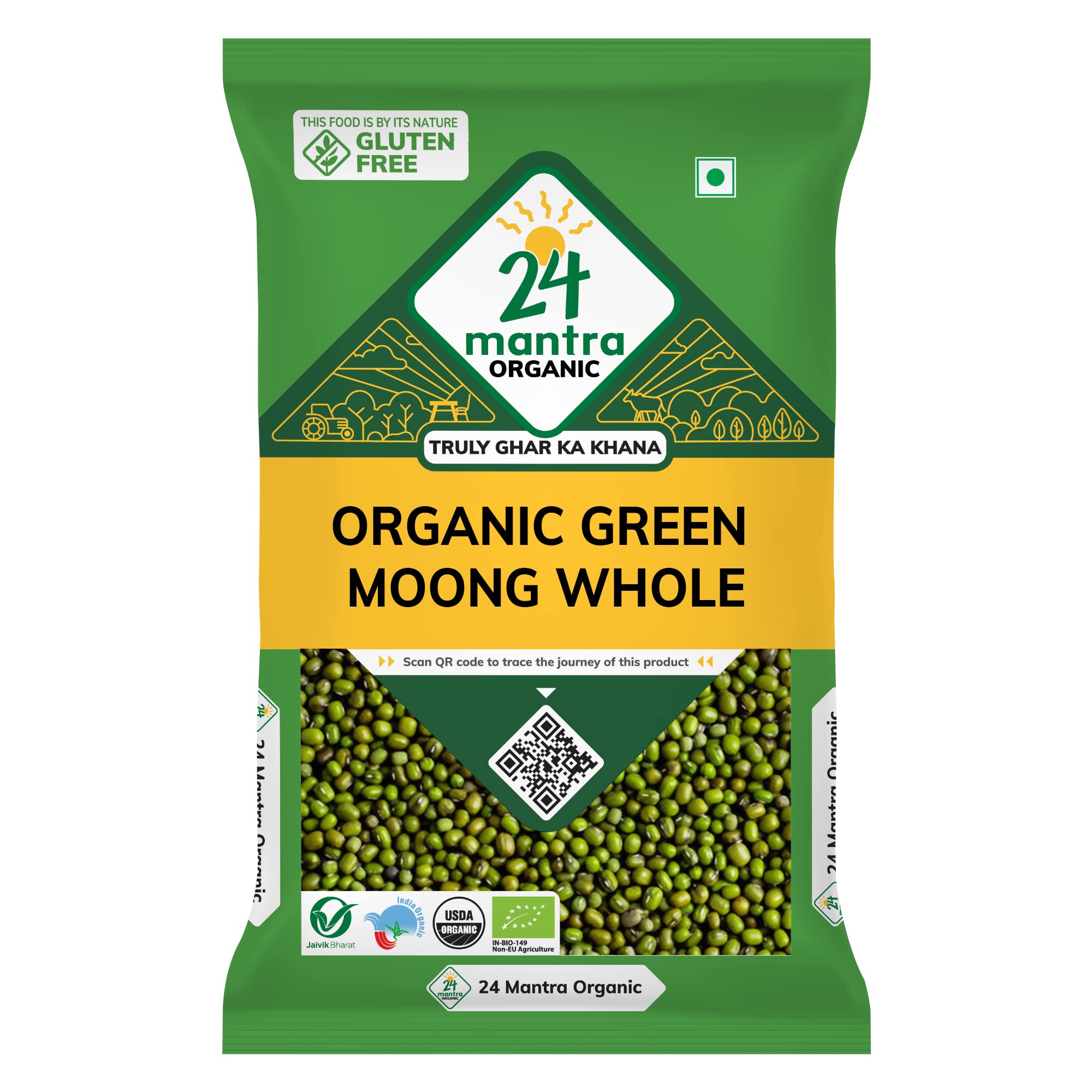 Product Description Pulses are a boon to vegetarians and vegans. It is a good source of calcium potassium and magnesium. 24 Mantra Organic Green moong dal is a good source of plant protein. There is research that says that substituting animal protein with plant protein improves lipid profile. Therefore effective in reducing the risk of heart-related problems. Similar positive results were seen when animal protein is replaced by plant protein on glucose levels in the blood. Green moong dal has a low glycemic index therefore we can call dals diabetic-friendly! From the Manufacturer The green moong dal is used to make jellies sweets curries dals and a host of other dishes around the world particularly in asia. The 24 mantra green moong dal whole is a wonderful product that lets you get the best and fresh green moong dal. Every part of this dal is used in preparing a large range of delicacies and dishes right from its starch-rich skin and protein-rich interior to the sprouts you get when it is moist. The 24 mantra green moong dal whole is packed with utmost care and is brought to the consumer unadulterated and with its quality intact. The best thing about this dal is that it is organically produced. With the polythene packing the dal remains fresh for long period of time. Moreover the dal is organically produced. Try this green moog dal from 24 mantra for a better health.What is Organic?Organic is a way a habit and a practice all rolled into one. It refers to a way of growing and processing food. It is also about the reliance on an ecological system that sustains itself on rich soil and proven traditional practices to grow crop and food that resists pests and diseases. Organic also means the farmers donât use toxic persistent pesticides fertilizers which are known to contaminate soil air water and the food. In fact organic farmers and farming involves practices of rotating crops deploying beneficial insects using locally honed methods adding composted manure and plant wastes to the soil.They choose solutions to the pests and disease problems that affect their crops in a way that does not damage and destroy the planet. Their wisdom is proven so are their practicesKey benefits No pesticides or harmful chemicalsBetter nutrition rich in antioxidantsBetter tasteBetter ecologySustainable -better planet for our childrenSafe foodNo water contaminationFarmers better lives10 reasons to go organic 1. Protect children and your family members from cancer causing pesticides 2. Say goodbye to chemicals in your diet 3. Get the taste of health and nutrition 4. Reduce health risks with Organic purity 5. Eat foods adhering to international standards 6. Protect the earth as organic farming is planet friendly 7. Prevent water contamination as there are no chemicals pollutants in organic farming 8. Gain from the diversity of crops which is becoming a thing of the past 9. Help small farmers and eliminate middlemen to create sustainable livelihoods 10. Stay in harmony with natureOur StandardsUS EU and India certified us. Organic certification is a process that helps producers of organic food and other organic agricultural products to get their products certified through internationally accredited certification bodies such as Control Union Onecert IMO Indocert etc. Organic certification is intended to assure quality and prevent fraud. âCertified organicâ label is a product assurance for consumers worldwide.The standards are laid down and administered in India by APEDA. The standard is called the NPOP National Programme for Organic Production. Similarly the US standard is called USDA NOP (National Organic Programme) standards and the European Union standards are specified by regulation EC 834/2007Our FarmersThey come with different sizes of land. They belong to different States of India. They enjoy a reputation of being empathetic to nature and the planet. They care about growing healthy pure food. Organic farming begins with good well meaning farmers. They are at the core of our journey. For us it means partnering with them in a way that benefits them and sustains their lands and longevity. We have 20000 farmers working on 30 farming projects spread over 100000 acres in 15 States in India.