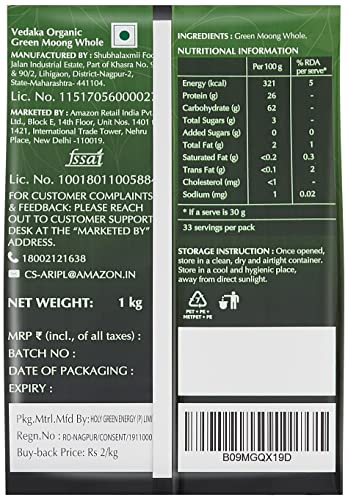 A staple in Indian diet Vedaka brings to you premium quality organic Whole Moong Dal (sabut) which is grown organically without the use of any fertilizers or pesticides. Vedaka Organic Whole Moong Dal is easy to cook and delicious and aromatic in taste. It undergoes a rigorous clean packaging procedure eliminating any kind of dust/foreign particles in the final product. It is hygienically packaged in a HACCP certified (a GFSI recognized Certification Programme) unit to ensure maximum retention of flavour and freshness. To retain freshness we recommend storing the dal in an airtight container once opened. Enjoy a delicious meal every time with Vedaka Organic Whole Moong Dal.