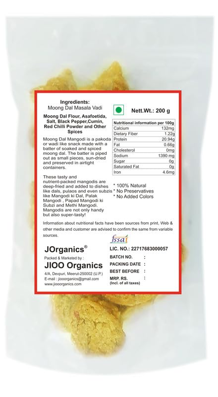 JOrganics Authentic Moong Dal VadiThese savory delights are made with whole moong dal spices and herbs and are then sun-dried to perfection. They are a great source of protein and fiber and are also gluten-free and vegan.Amritsari Badi with True FlavorsThese wadi are inspired by the traditional Amritsari style and are made with the same authentic flavors. They are a delicious snack or side dish and can also be added to soups salads or curries.Wholesome Moong Dal GoodnessMoong dal is a nutrient-rich legume that is high in protein fiber and iron. It is also a good source of vitamins A and C. These wadi are a great way to get your daily dose of these essential nutrients.Key BenefitsMade with whole moong dalGluten-free and veganA good source of protein fiber and ironDelicious snack or side dishCan be added to soups salads or curriesOrder your pack of JOrganics Authentic Moong Dal Vadi today and enjoy the taste of wholesome goodness!