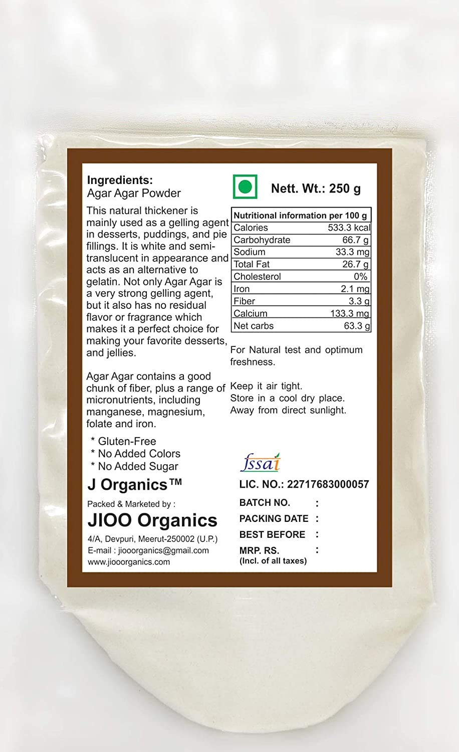 JOrganics AGAR AGAR POWDERDerived from red seaweed this natural thickener is mainly used as a gelling agent in desserts puddings and pie fillings. It is white and semi-translucent in appearance and acts as an alternative to gelatin. Not only Agar Agar is a very strong gelling agent but it also has no residual flavor or fragrance which makes it a perfect choice for making your favorite desserts and jellies.No TasteNo OdourNo ColourFULL OF NUTRIENTSAgar Agar contains a good chunk of fiber plus a range of micro nutrients including manganese magnesium folate and iron.ACTS AS A THICKENING AGENTUseful to thicken soups make jams and jellies custards ice creams and other desserts that need to gelatinize and set.HELPS IN WEIGHT MANAGEMENTAgar Agar gives a sensation of fullness leading it to be used in some diet products.BEAUTY BENEFITSAgar Agar can be used to soften and moisturize skin and hair. In cosmetic industry it is used as a raw material in making lipstick soap ointments lotion and cream.Direction For Use Mix all the ingredients along with the agar powder. Stir it into the liquid at room temperature that needs to be gelled and let it sit for 5 minutes. Bring it to a rolling boil & make sure the agar has been dissolved properly. Pour into moulds and let it set.Note: Never mix agar powder with warm/hot water as it will clump and become impossible to dissolve.*24x7 service available