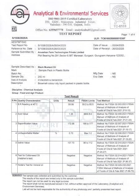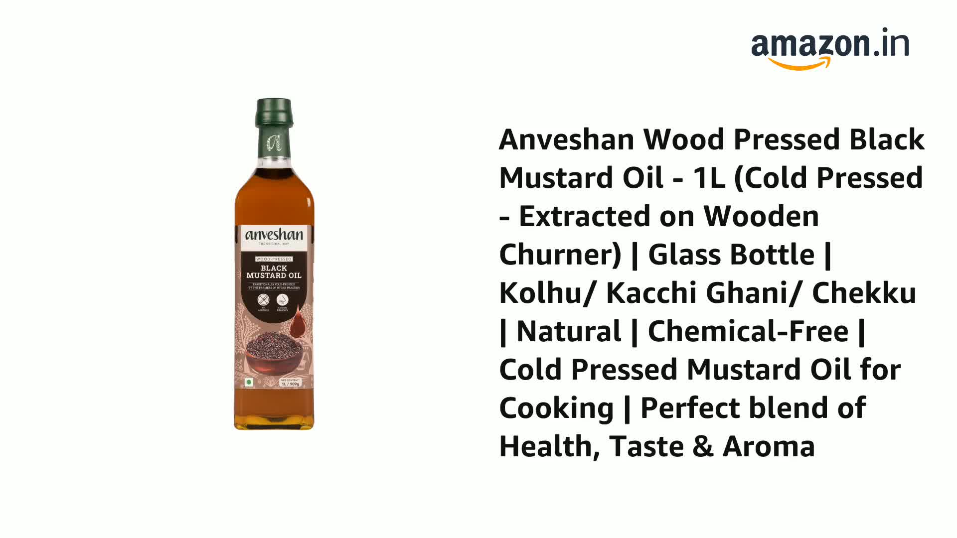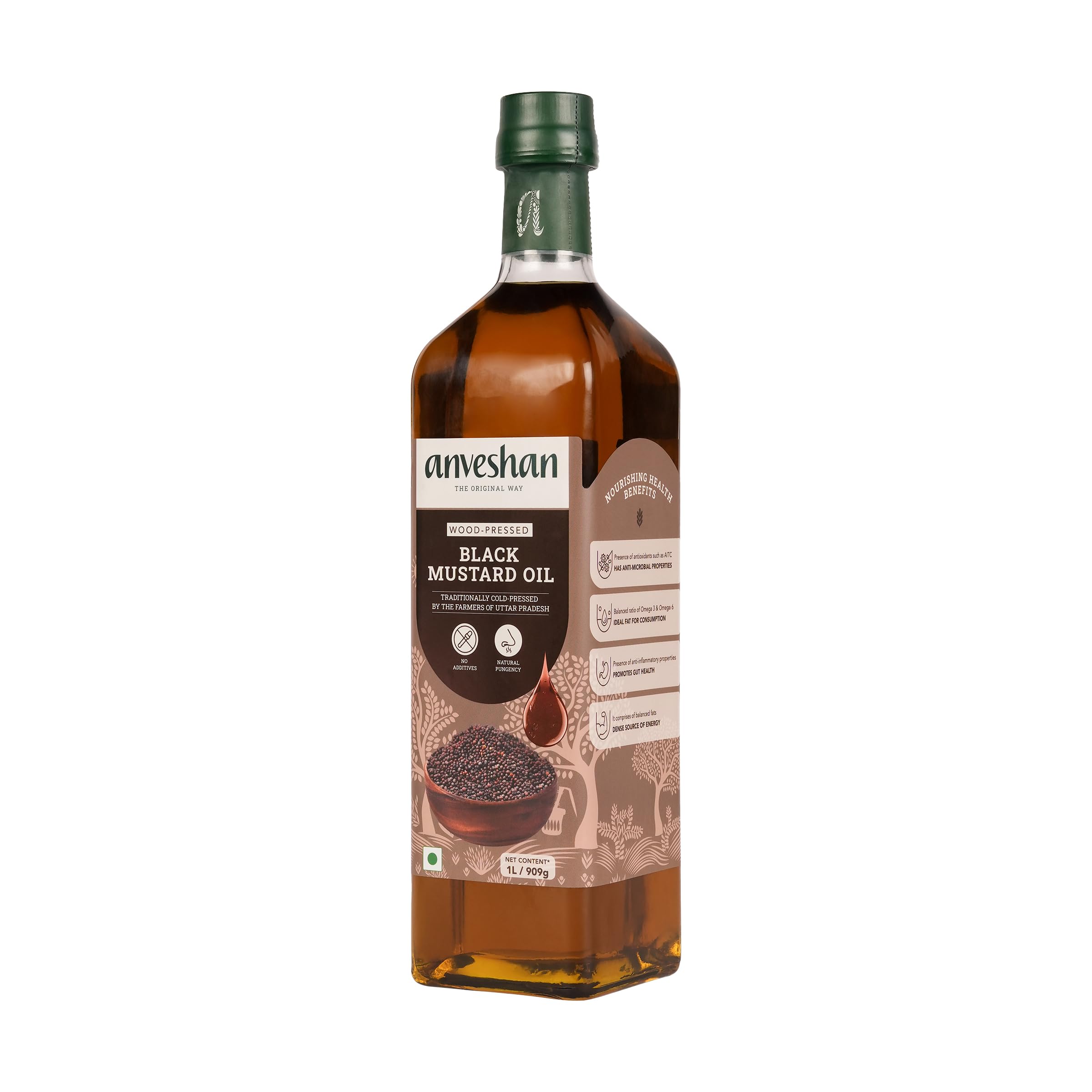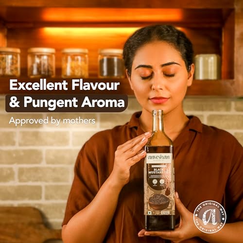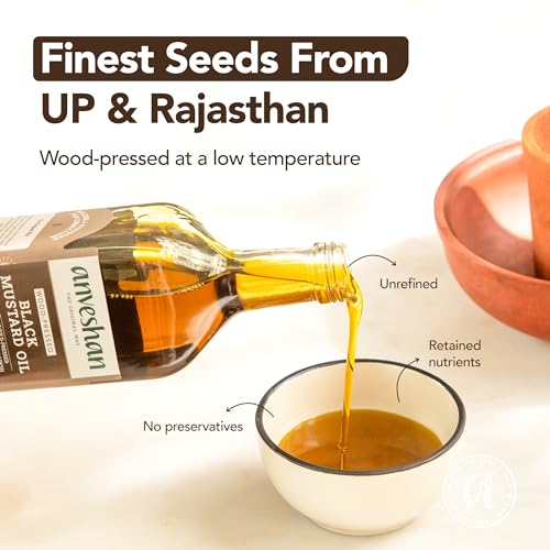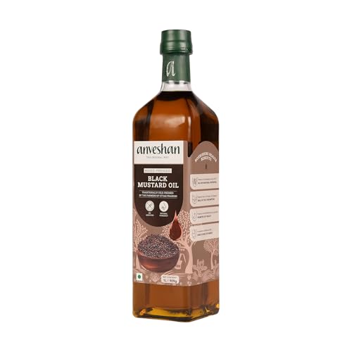 Anveshan Wood Pressed Black Mustard Oil - 1L (Cold Pressed - Extracted on Wooden Churner) | Glass Bottle | Kolhu/ Kacchi Ghani/ Chekku | Cold Pressed Mustard Oil for Cooking | Perfect blend of Health, Taste & Aroma