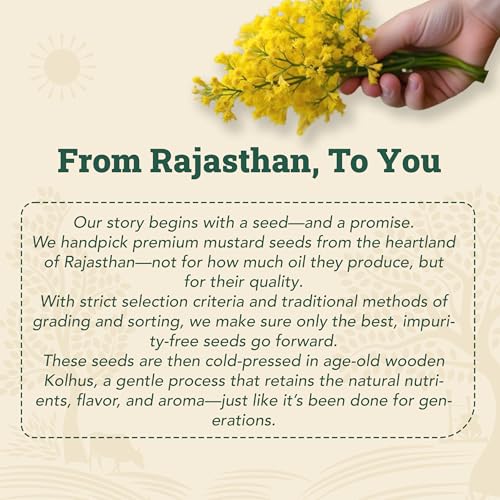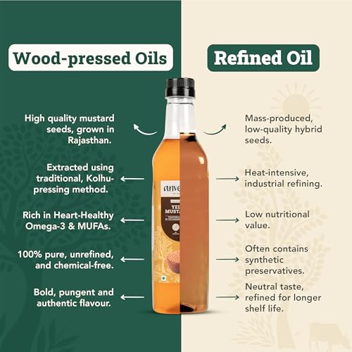 • WOOD PRESSED OIL: Our Wood Pressed Yellow Mustard Oil is 100% pure vegan preservative-free chemical-free &. We Cold Press the mustard seeds in wooden Kolhus at a low temperature. We use -press technology to ensure that the nutrients remain intact. Then we
