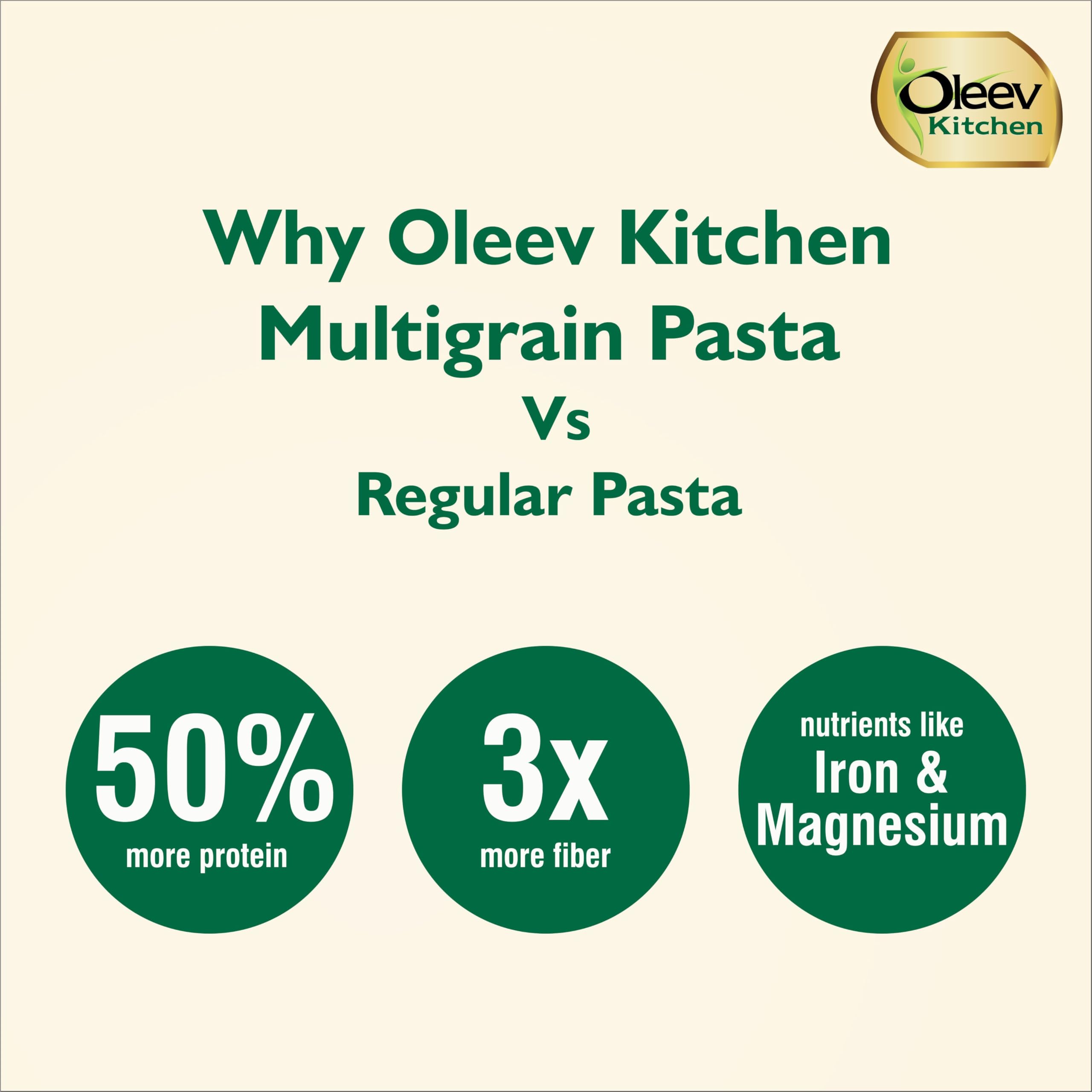 Introducing Oleev Kitchen Multigrain pasta packed with the goodness of 4 grainsâDurum wheat Chickpea Jowar and Brown Rice. It's the healthier alternative to your regular pasta with no maida. Rich in protein fiber iron and magnesium multigrain pasta offers happy wholesome goodness for your meals.