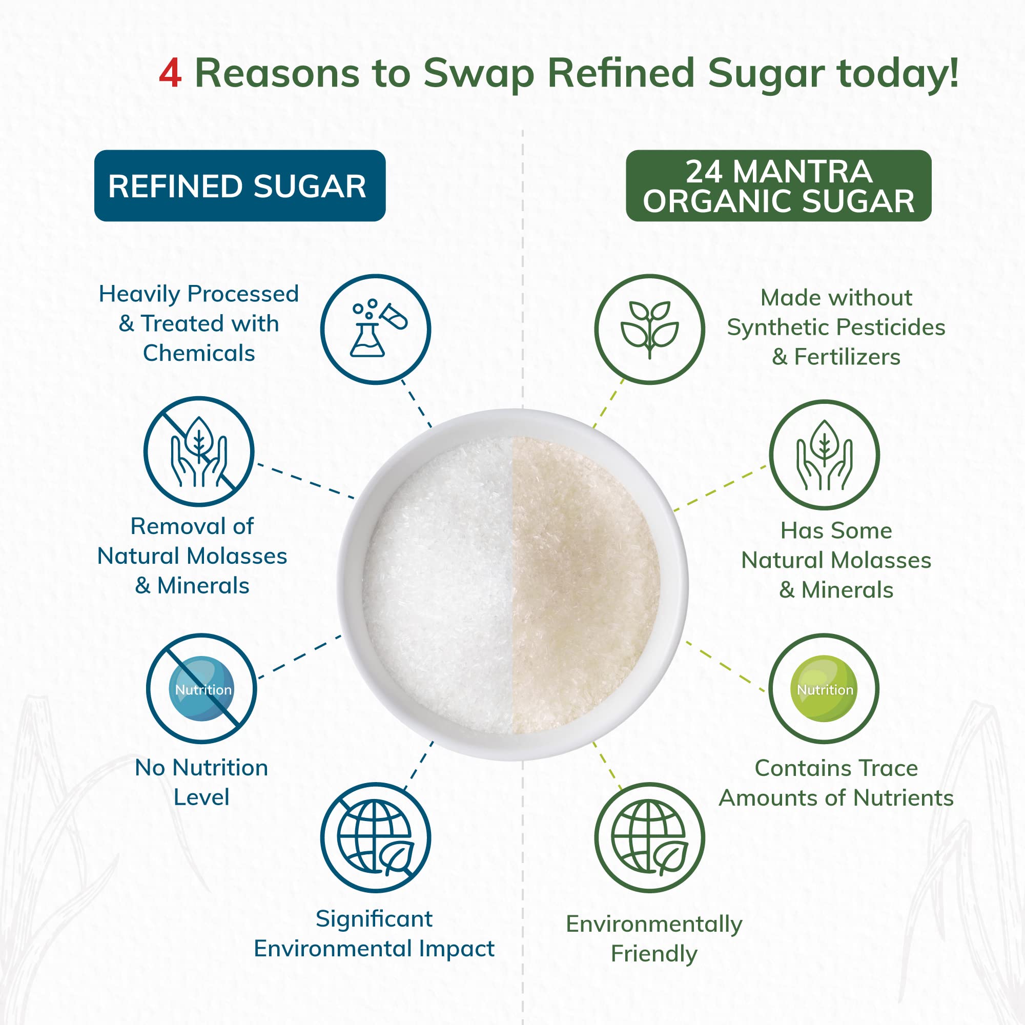 Product Description Sugar denotes sweetness. Cane sugar/Organic Sugar is an ingredient that has been around for a long time. Any auspicious moment or happy incident is marked by eating sweet which is a taste usually contributed by sugar. Any celebration is incomplete without sugar! Sugar occupies a very unique place in our culture. Sugar is a simple carbohydrate that is used in a variety of recipes from simple tea to gourmet Tiramisu. 24 Mantra Organic Sugar is made from a certified organic sugarcane crop From the Manufacturer 24 mantra brings to you organic sugar that is perfect for every health-conscious person who cares for natural products. Organic sugar is a product of organic farming. A special variety of sugarcane is cultivated with no chemical treatment i.e. Without the use of chemical fertilizer insecticide and pesticide. To grow organic sugar cane organic manure like dung or compost is used. 24 mantra ensures that customers get the best quality natural and pure organic sugar. This organic sugar is absolutely pure because even for processing vegetable clarification agent and herbal extracts are used to clean the sugar. Only 40 percent sugar can be produced from such brown sugarcane.What is Organic?Organic is a way a habit and a practice all rolled into one. It refers to a way of growing and processing food. It is also about the reliance on an ecological system that sustains itself on rich soil and proven traditional practices to grow crop and food that resists pests and diseases. Organic also means the farmers don't use toxic persistent pesticides fertilizers which are known to contaminate soil air water and the food. In fact organic farmers and farming involves practices of rotating crops deploying beneficial insects using locally honed methods adding composted manure and plant wastes to the soil.They choose solutions to the pests and disease problems that affect their crops in a way that does not damage and destroy the planet. Their wisdom is proven so are their practicesKey benefits No pesticides or harmful chemicalsBetter nutrition rich in antioxidantsBetter tasteBetter ecologySustainable -better planet for our childrenSafe foodNo water contaminationFarmers better lives10 reasons to go organic 1. Protect children and your family members from cancer causing pesticides 2. Say goodbye to chemicals in your diet 3. Get the taste of health and nutrition 4. Reduce health risks with Organic purity 5. Eat foods adhering to international standards 6. Protect the earth as organic farming is planet friendly 7. Prevent water contamination as there are no chemicals pollutants in organic farming 8. Gain from the diversity of crops which is becoming a thing of the past 9. Help small farmers and eliminate middlemen to create sustainable livelihoods 10. Stay in harmony with natureOur StandardsUS EU and India certified us. Organic certification is a process that helps producers of organic food and other organic agricultural products to get their products certified through internationally accredited certification bodies such as Control Union Onecert IMO Indocert etc. Organic certification is intended to assure quality and prevent fraud. Certified organic label is a product assurance for consumers worldwide.The standards are laid down and administered in India by APEDA. The standard is called the NPOP National Programme for Organic Production. Similarly the US standard is called USDA NOP (National Organic Programme) standards and the European Union standards are specified by regulation EC 834/2007Our FarmersThey come with different sizes of land. They belong to different States of India. They enjoy a reputation of being empathetic to nature and the planet. They care about growing healthy pure food. Organic farming begins with good well meaning farmers. They are at the core of our journey. For us it means partnering with them in a way that benefits them and sustains their lands and longevity. We have 20000 farmers working on 30 farming projects spread over 100000 acres in 15 States in India.