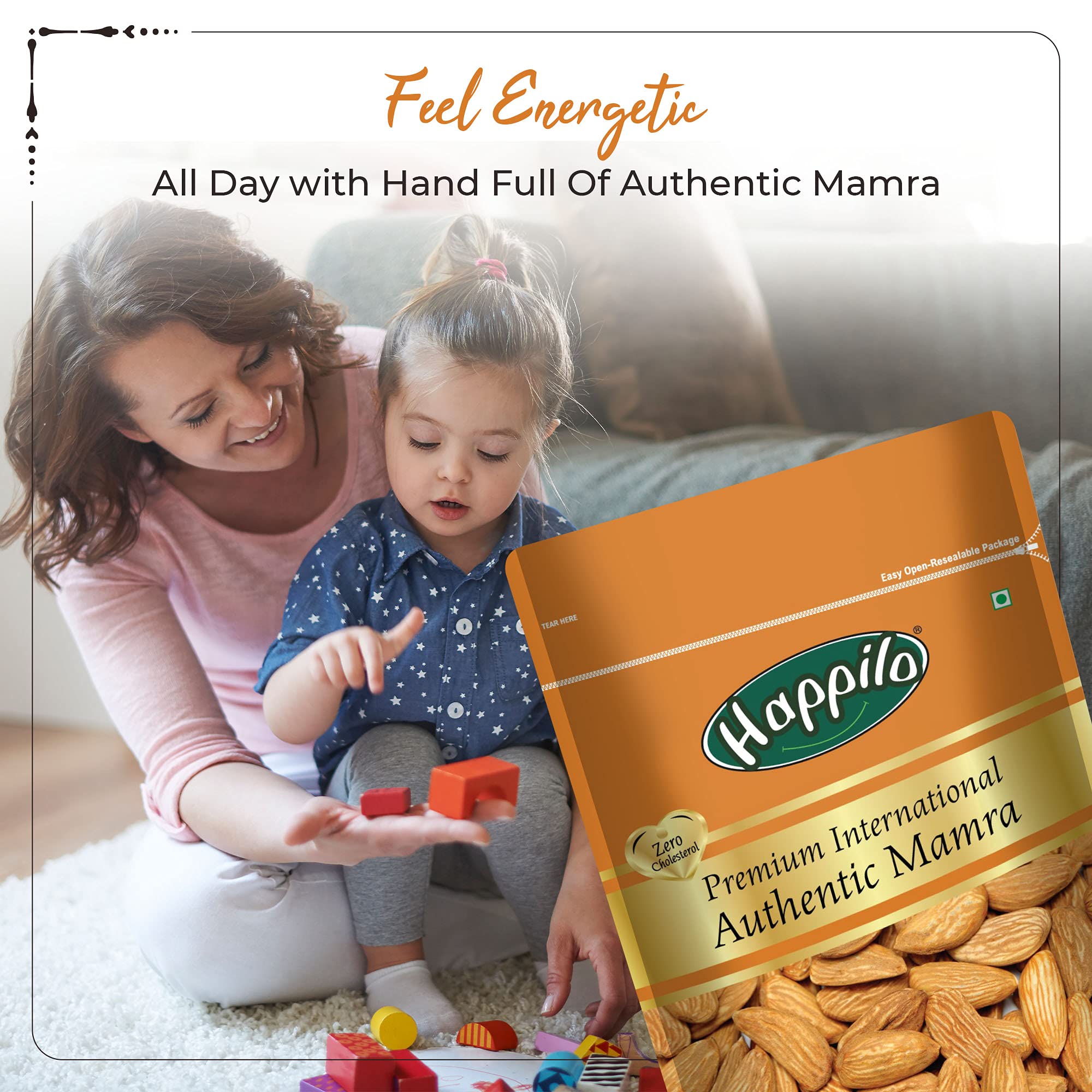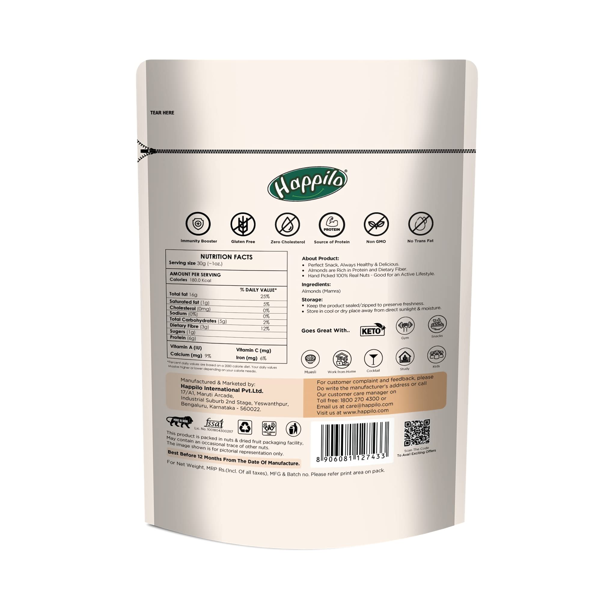 Happilo 100% Natural Premium Mamra Almonds is 100% Real nuts- good for an active life style It's High in Protein Dietary Fiber Gluten Free Non-GMO Zero Trans Fat & Zero Cholesterol. A pack of nut that prepares you for a power packed day ahead. Happilo Zip Lock Pouch with airtight seal to ensure the product is protected and fresh. Quality assured - Happilo products are rigorously tested against the industry's best quality standards.
