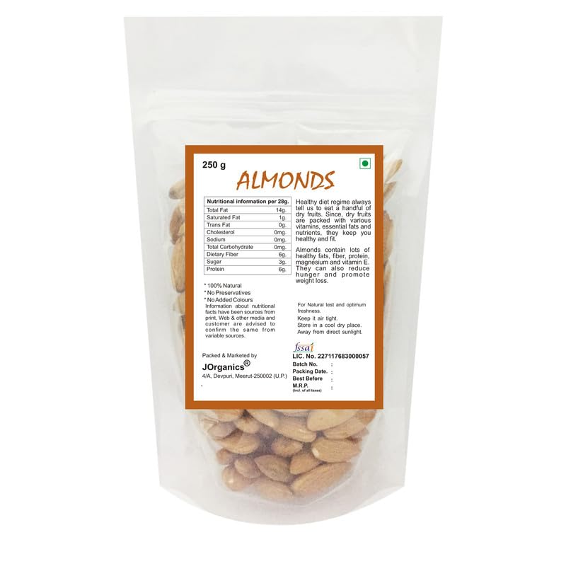 JOrganics Almond 250gm Dry Fruits Nuts & Seeds | Healthy Natural Snack | Rich in Protein Fiber & Antioxidants | Boost Energy & Immunity | 100% Pure & Fresh