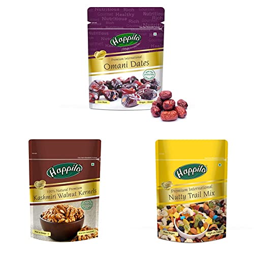 Happilo Dried Premium International Omani Dates 250gHappilo has travelled the world to get the finest gourmet dry fruits. They are one of the most nutritious dried fruits in the world they're a yummy healthy snack. Great for Snacking adding to Cereal Cooking and Baking. High Antioxidants Dietary Fiber No Gluten Non GMO Zero Trans Fat & Zero Cholesterol. Daily need products for a healthy and energetic life. Happilo Zip Lock Pouch with airtight seal to ensure the product is protected and fresh. Quality assured - Happilo products are rigorously tested against the industry's best quality standards.Happilo Premium International Trail Mix 200gIf you are looking for a high energy snack which tastes great then Happilo Trail Mix is perfect for you. A combination of dried fruits nuts smarties makes this a true delight and a perfect gift for your loved ones. High in nutrients and healthiness the mix will certainly keep your mouth shut till you finish eating. Time to be happy lovely and healthy.Happilo Premium 100% Natural Kashmiri Walnuts Kernels 200g Dry FruitsHappilo has travelled the world to get the finest gourmet dry fruits dried fruits nuts berries and dates. Indulge into the gourmet and grocery world of Happily with awesome natural nuts and dry fruits along with the unique dry fruit mixes fusions and flavoured dry fruits healthy seeds and dried berries specially crafted for your taste and health.