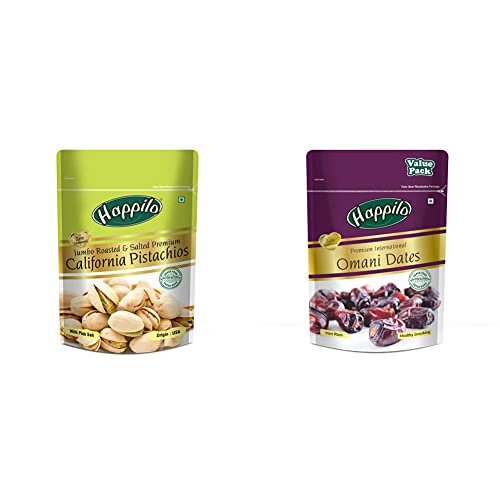 Happilo Premium Californian Roasted and Salted Pistachios 200gPistachios are a wonderful fun & Tasty snack which are lightly salted. Crack open the shells to treat your taste buds for a snacking sensation.Happilo Premium International Omani Dates Value Pack Pouch 680 gHappilo omani dates also known as khajoor are one of worlds most delicious farm fresh dates. Omani dates have the hidden quality of boosting energy instantly! Hence they are not just apt during festive season but are also a must-have snack for the entire year. It is superfood for super energy levels. Our products are packed under highest level of hygiene retaining all the goodness of nature.
