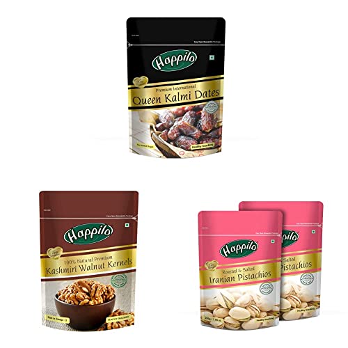 Happilo Premium International fresh Queen Kalmi Dates 200gm & Premium 100% Natural Kashmiri Walnuts Kernels 200g Dry Fruits & Happilo Premium Californian Roasted and Salted Pistachios 200g