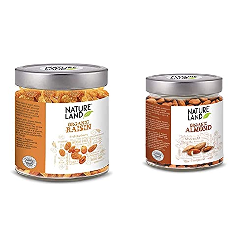 Natureland Organics Raisins / Kismis 250 Gm - Organic RaisinsOrganic raisins pack more nutrition than their small size might indicate. When grapes are dehydrated to produce raisins the nutrients become more concentrated making a handful of raisins a snack rich in b vitamins iron and potassium. Besides nutrients raisins are also a good source of carbohydrates for energy. Best organic grocery and gourmet.Natureland Organics Almonds 250 Gm Healthy Organic Dry FruitsNatureland's Organic almonds. The health benefits of almonds include lower blood sugar levels reduced blood pressure and lower cholesterol levels. They can also reduce hunger and promote weight loss. It also helps in maintenance of healthy hair skin care (psoriasis) and dental care since it is a rich source of vitamin E calcium phosphorous iron and magnesium. It also contains zinc selenium copper and niacin. Natureland's organic almonds trace back their origin from the hills of Jammu and Kashmir and valley of himanchal Pradesh these almonds sourced from the organic grown selected trees after three years of planting the trees and green almonds are de shelled to give you the best quality of non pasteurized shelled almonds. Best organic grocery and gourmet.
