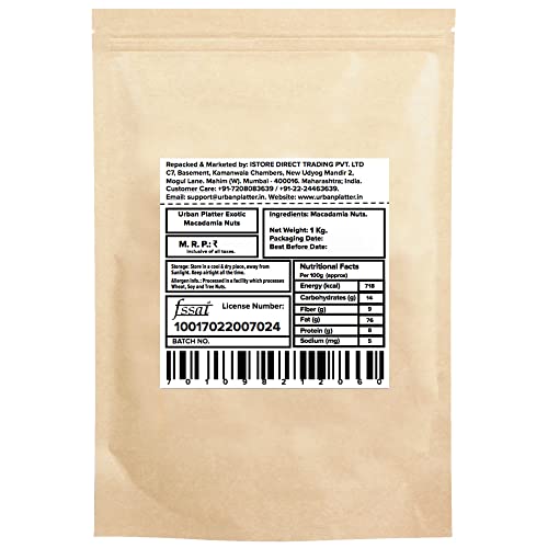 Urban Platter Bold and Exotic Macadamia Nuts 1kg (Grade A Premium Quality Crunchy perfect for guilt-free snacking)These nuts can be consumed as they are or with tea/ coffeeCan be roasted and salted to give oneself a delightful treat They have the highest amount of beneficial mono unsaturated fats of any known nut. Thus they are considered great for patients with hyperemia and You can dip them in chocolate sauce and freeze to get yummy chocolate flavored macadamia nuts Once opened refrigerate and use macadamia nuts within two months