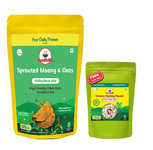 Foodfrillz Sprouted Moong-Oats Healthy Chilla / Dosa/ Salted Pancake Breakfast Mix 200 g + Free Coconut Chutney Powder Trial Pack (25 g)