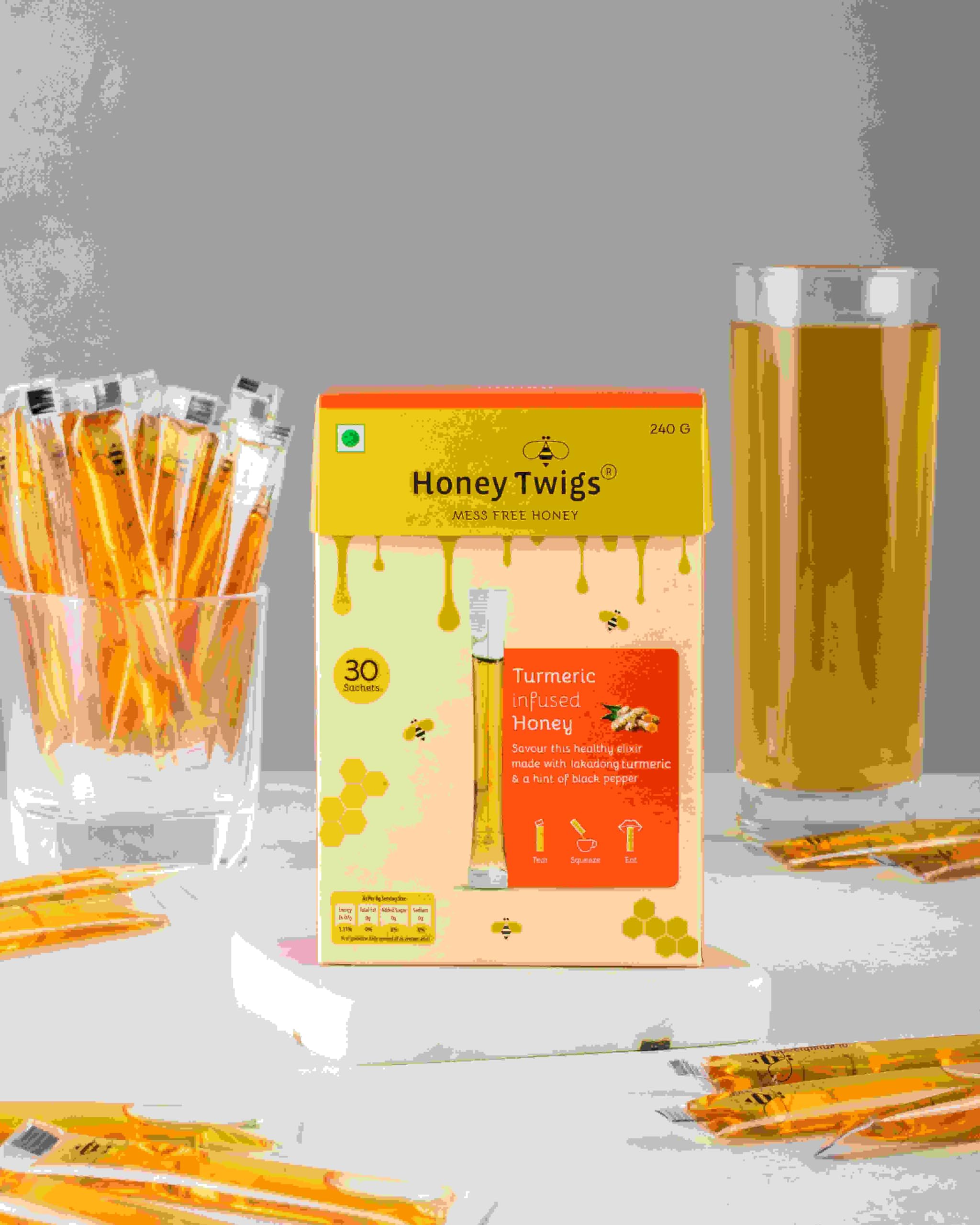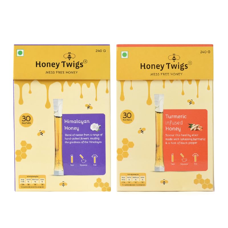 Honey Twigs Natural Honey | Himalayan Multi Floral Honey and Turmeric Honey 480g(240g + 240g - 60 Twigs) | Infused with Natural Ingredients | Pure Honey | No Added Color | No Preservatives