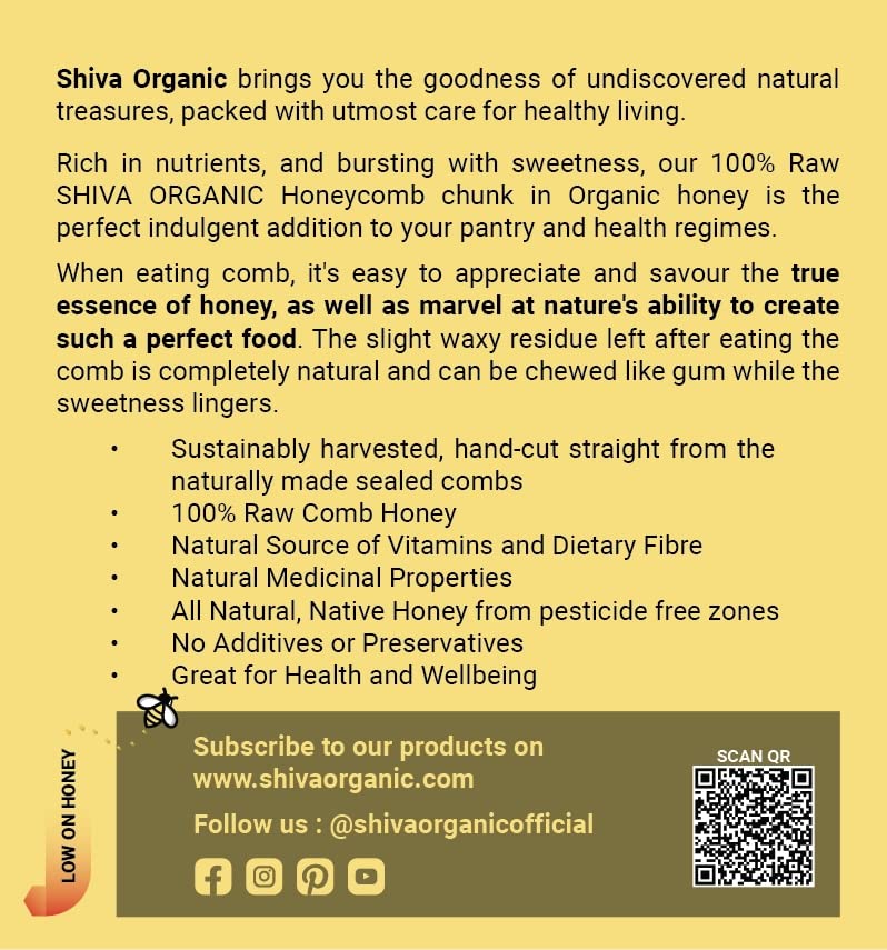 A fresh raw comb is the jewel of the hive which is pure and 100% natural. The comb is harvested from the bee hive and directly bottled. It has an experience of great taste and nutrition. It is majorly comprised of fresh raw honey and beeswax. It is unfiltered and unprocessed. Rich in nutrients and bursting with sweetness our 100% Raw SHIVA ORGANIC Honeycomb chunk in Organic honey is the perfect indulgent addition to your pantry and health regimes. When eating comb it's easy to appreciate and savour the true essence of honey as well as marvel at nature's ability to create such a perfect food. The slight waxy residue left after eating the comb is completely natural and can be chewed like gum while the sweetness lingers. 100% raw comb honey Natural Source of Vitamins and Dietary Fibre Organic and GMO-Free Natural Medicinal Properties Unfiltered and Unprocessed All Natural Native Honey from pesticide free zones No Additives or Preservatives Sustainably Harvested Hand Cut straight from the naturally made combs Great for Health and Wellbeing