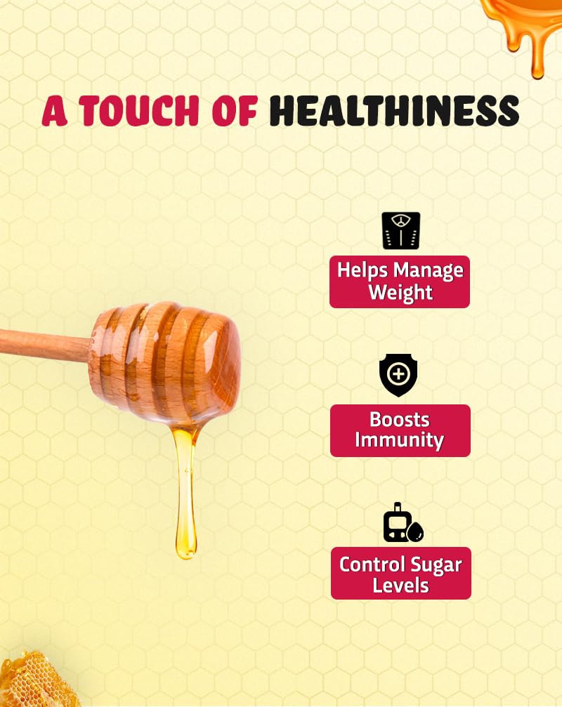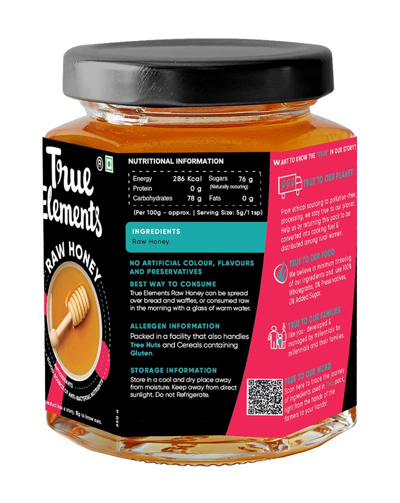 True Elements Raw Honey is 100% natural with no preservatives or artificial colors. It is naturally extracted from the beehives and does not go through any heating or pasteurization, which helps to retain its nutrients.Raw Honey is anti-inflammatory and rich in antioxidants. It is a great healthy alternative to sugar and can be used as a sweetener for many dishes. It is beneficial for skin and digestion. You can enjoy it raw or drink it with water.Raw Honey can also be enjoyed as a topping over Pancakes, Oatmeals or any cereal of your choice!Note: Raw honey may naturally vary in colour and texture due to crystallization, which occurs over time because of the natural sugars in honey.Storing it in cool temperatures, even during winter, can accelerate this process, but crystallization doesnt affect the quality or safety of the honey. To restore it to liquid form, simply warm the bottle gently in hot water, avoiding overheating to preserve nutrients.Our honey is 100% pure, natural, and free from added sugars or jaggery, with every batch rigorously tested for quality and purityIngredients