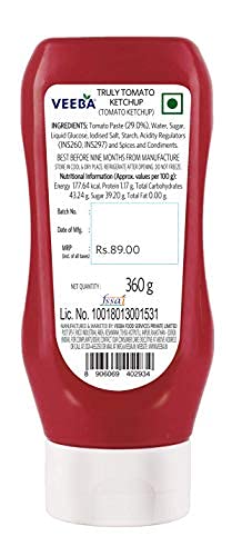 Veeba Truly Tomato ketchup does not contain any added preservatives chemicals artificial color or flavor; which makes it a healthy & tasty sauce for you and your family. It contains approximately 20% more tomato content than the leading brands in the category. Made with fresh tomatoes this delicious tomato ketchup from Veeba adds a sweet & tangy twist to any snack.