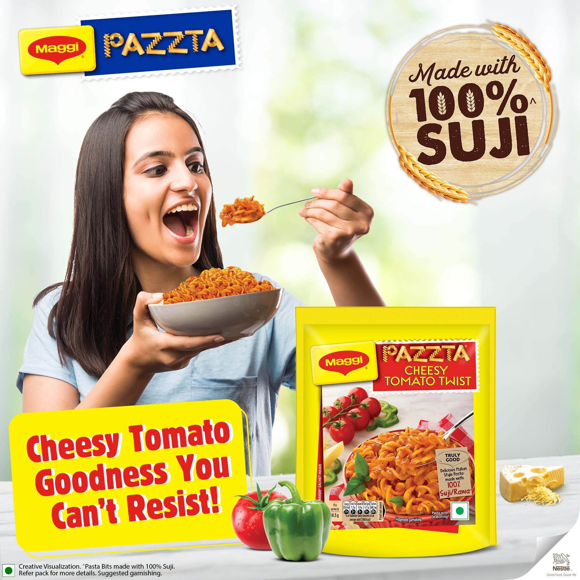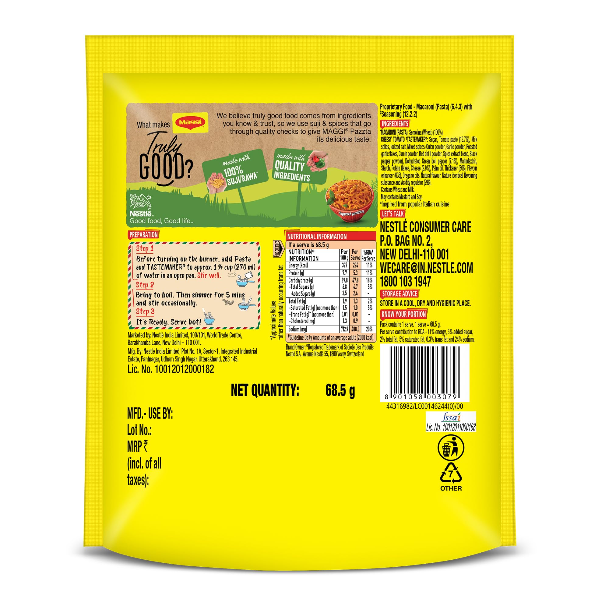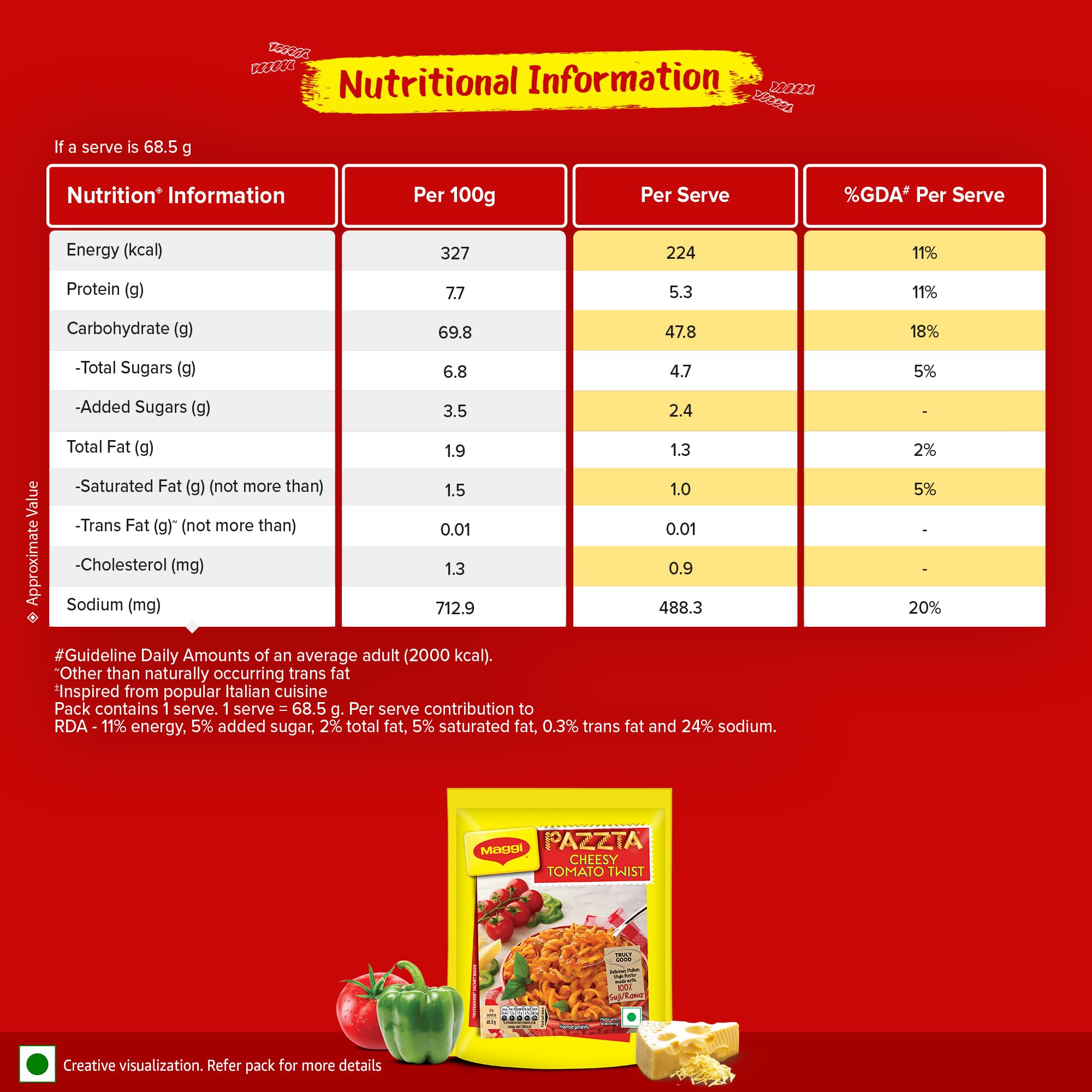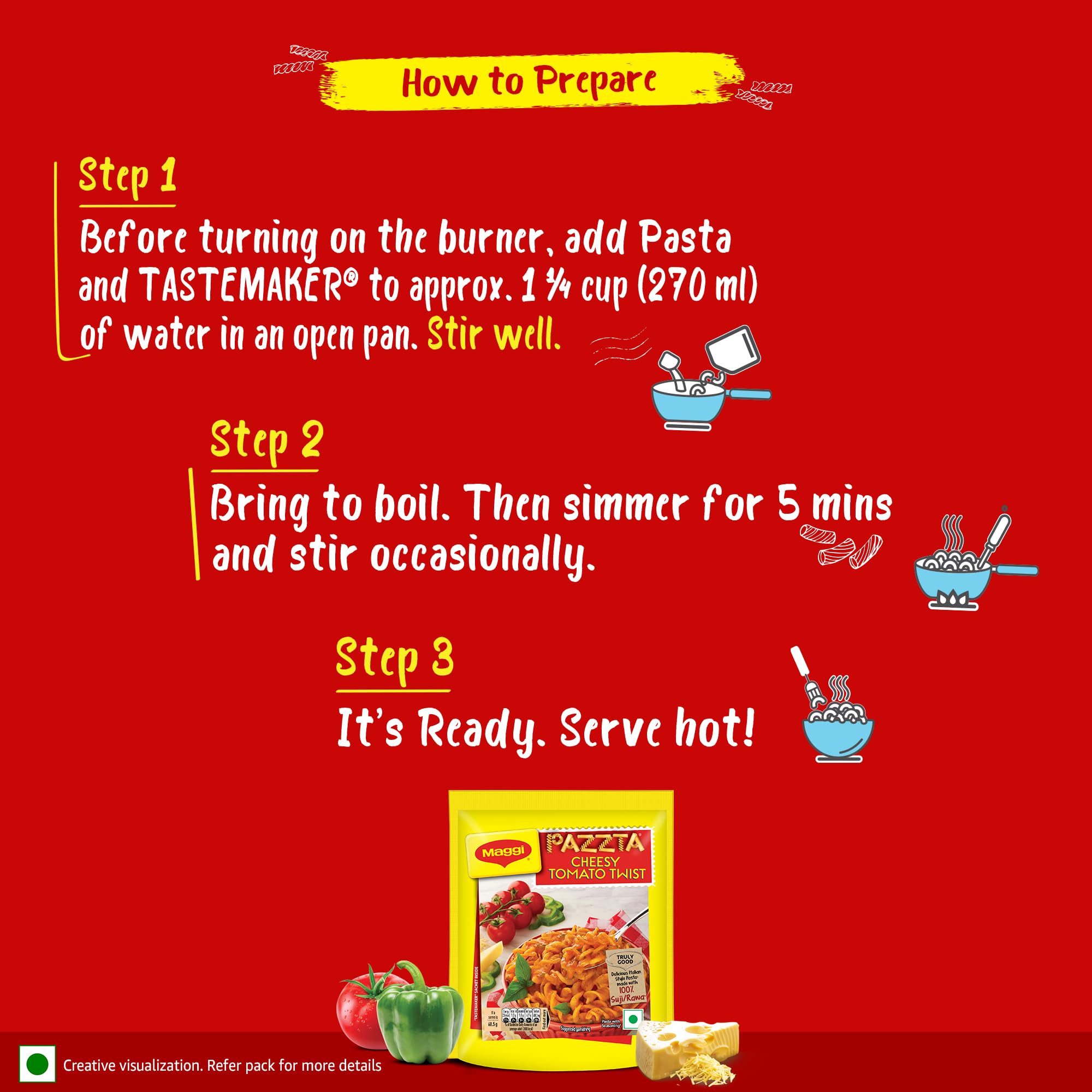 MAGGI Cheesy Tomato Twist Pazzta is delicious quick and easy. The pasta is made with 100% suji/ rawa (semolina) and is ready in just 5 minutes! It makes a great snacking option or sides for your everyday meals. Toss in some bell peppers or olives to make your pasta meal more wholesome and delicious!Available in saucy lip-smacking flavours and shapes - Masala Penne Cheese Macaroni Mushroom Penne and Tomato Twist. So now go ahead and indulge yourself with the saucy & creamy flavours of MAGGI Pazztas.Usage Instructions: 1. To prepare a bowl of lip-smacking pasta add pasta and Tastemaker to 2 cups of water in an open pan. 2. Bring it to boil and its ready. 3. Toss in some olives and bell pepper for more wow. Serve hot.Allergens: May contain soya and mustard. Storage Instruction: Store in a cool dry and hygienic place.